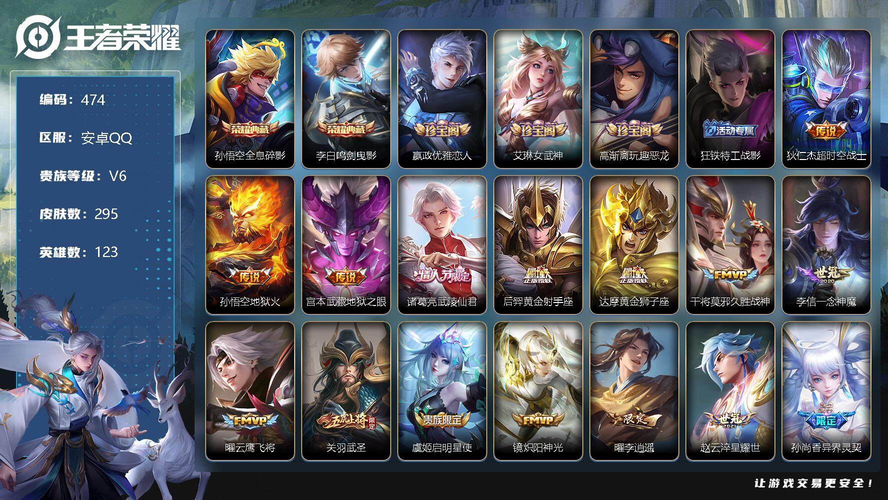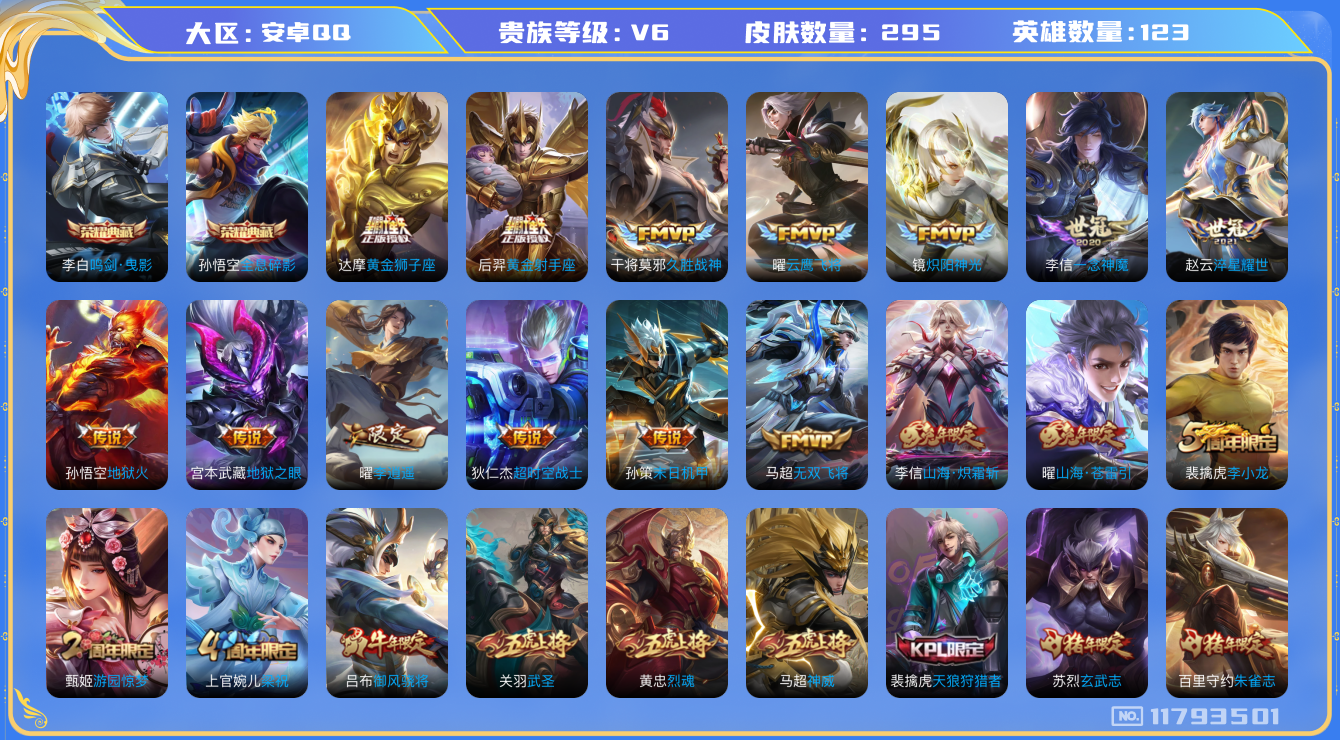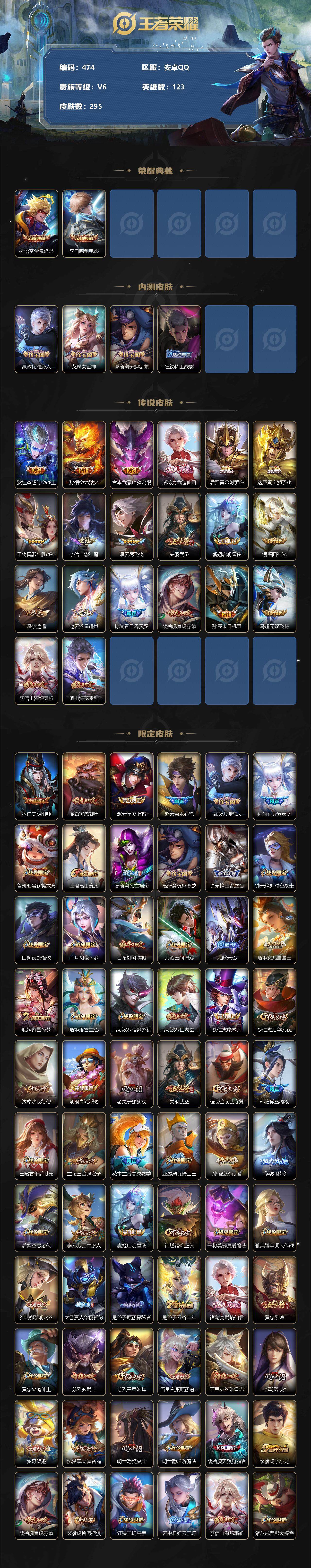 [11793501]【商品标题】:安卓Q-V6-荣耀黄金I段位-123英雄-295皮肤-2典藏-0珍品无双-0无双-0珍品传说-20传说-92史诗