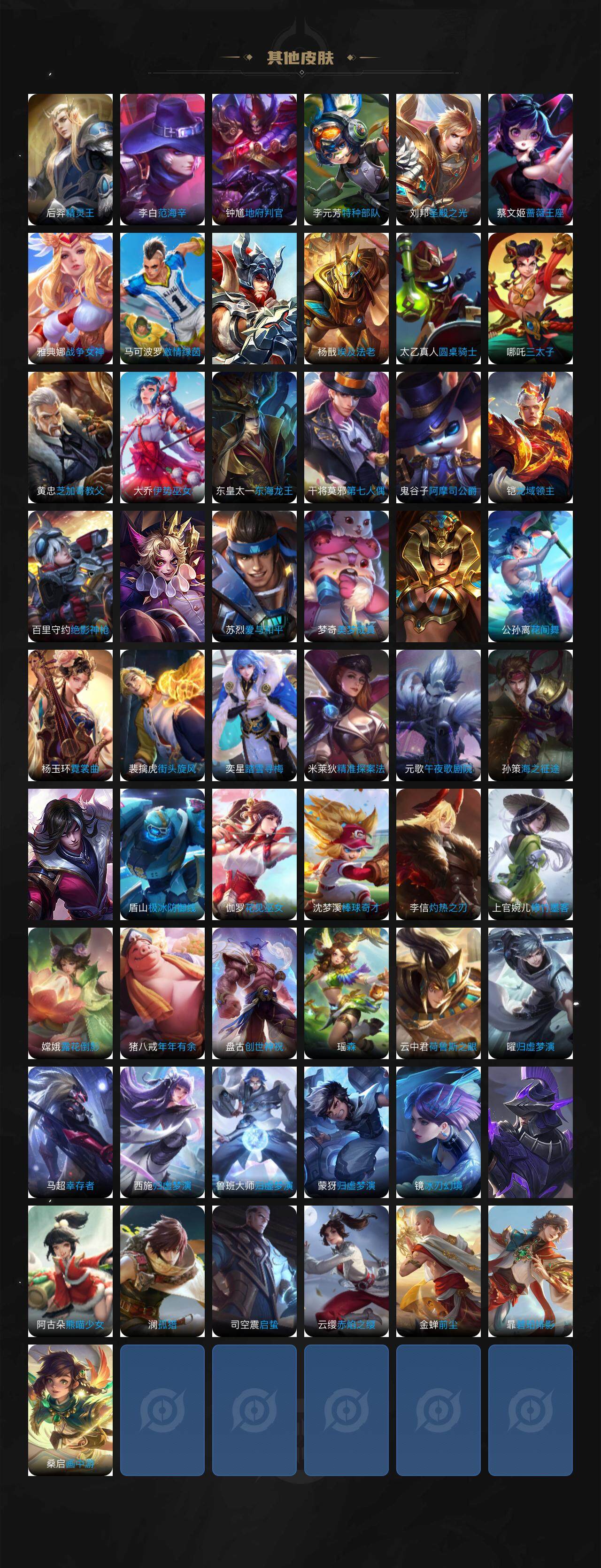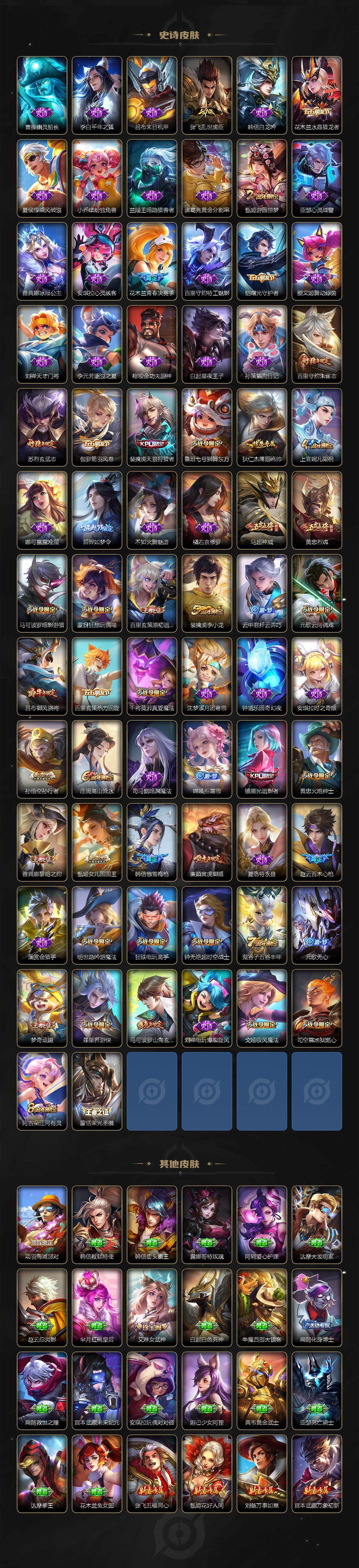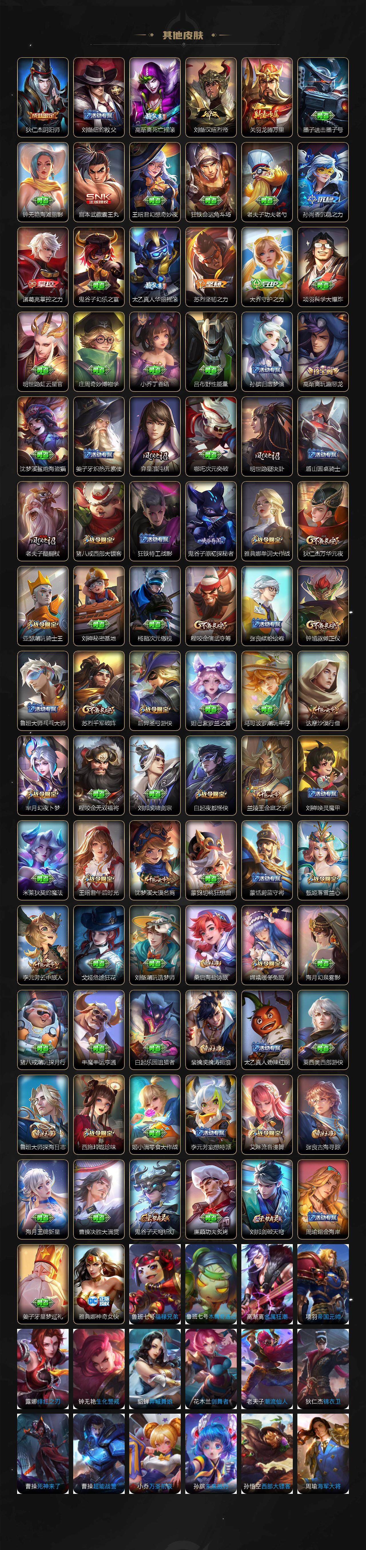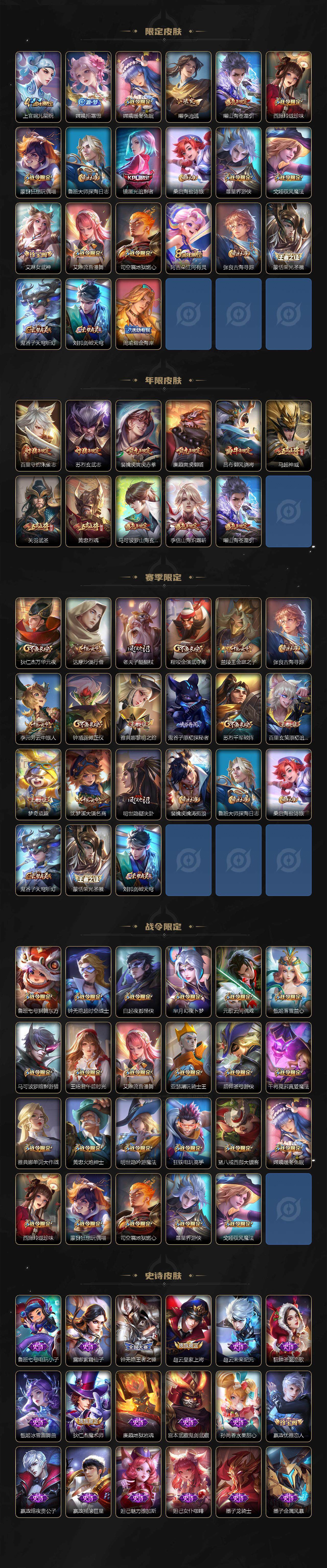 【限定皮肤】:狄仁杰阴阳师,廉颇寅虎御盾,赵云皇家上将,赵云百木心枪,嬴政优雅恋人,孙尚香异界灵契,鲁班七号狮舞东方,庄周高山流水,高渐离死亡摇滚,高渐离玩趣恶龙,钟无艳王者之锤,钟无艳超时空战士,白起夜都怪侠,芈月幻夜卜梦,吕布御风骁将,元歌云间偶戏,元歌无心,甄姬女儿国国王,甄姬游园惊梦,甄姬落雪兰心,马可波罗暗影游猎,马可波罗山海玄木吟,狄仁杰魔术师,狄仁杰万华元夜,达摩沙漠行僧,项羽海滩派对,老夫子醍醐杖,关羽武圣,程咬金演武夺筹,韩信傲雪梅枪,王昭君午后时光,兰陵王金庭之子,花木兰青春决赛季,亚瑟潮玩骑士王,孙悟空孙行者,后羿如梦令,后羿圣弓游侠,李元芳云中旅人,虞姬启明星使,钟馗驱傩正仪,干将莫邪真爱魔法,雅典娜单词大作战,雅典娜黎明之约,太乙真人华丽摇滚,鬼谷子原初探秘者,鬼谷子五谷丰年,诸葛亮武陵仙君,黄忠烈魂,黄忠火炮绅士,苏烈玄武志,苏烈千军破阵,百里玄策原初追逐者,百里守约朱雀志,弈星混沌棋,梦奇顽趣,沈梦溪大漠名商,明世隐疑决卦,明世隐吟游魔法,裴擒虎天狼狩猎者,裴擒虎李小龙,裴擒虎寅虎赤拳,裴擒虎擒涛扼浪,狂铁电玩高手,云中君纤云弄巧,李信山海炽霜斩,猪八戒西部大镖客,上官婉儿梁祝,嫦娥拒霜思,嫦娥暖冬兔眠,曜李逍遥 ,曜山海苍雷引,西施玲珑珍味,蒙犽狂想玩偶喵,鲁班大师探海日志,镜匿光追影者,桑启海盐诗旅,暃星界游侠,戈娅驭风魔法,艾琳女武神,艾琳流音漫舞,司空震地狱燃心,阿古朵江河有灵,张良古海寻踪,蒙恬荣光圣徽,鬼谷子天穹祈灯,刘邦剑破天穹,周瑜熔金海岸
