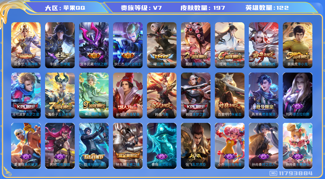 [11793884]V7 1典藏 6传说 122英雄 197皮肤 可修改实名 优质装备:九霄神辉(木兰典藏),云鹰飞将(小将军),一念神魔,地狱之眼,超时空战士-狄仁杰 珍宝阁皮:妄想食味,玩趣恶龙 限定皮:鸣野蒿,飞衡(韩信年限),高山流水,五谷丰年,游园惊梦,逐梦之星,祈雪灵祝(雪兔子),李小龙,逐梦之影,朱雀志(守约年限),大圣娶亲 史诗皮:特工魅影,千年之狐,百解令(蒙犽),高渐离燃音魔法,无限星赏官,偶像歌手,暗夜猫娘,时之恋人-孙尚香,乱世虎臣,水果甜心,天才门将,星夜王子,心灵骇客,功夫厨神,德古拉伯爵,暗隐猎兽者,幽灵船长,鬼剑武藏,心灵战警,纤云弄巧,缤纷独角兽,乘风破浪,逐浪之夏,水晶猎龙者,曙光守护者,金属风暴,原初追逐者,圣诞狂欢,圣诞恋歌,鹰眼统帅,王者之锤,魅力维加斯,黎明之约,未来纪元-赵云
