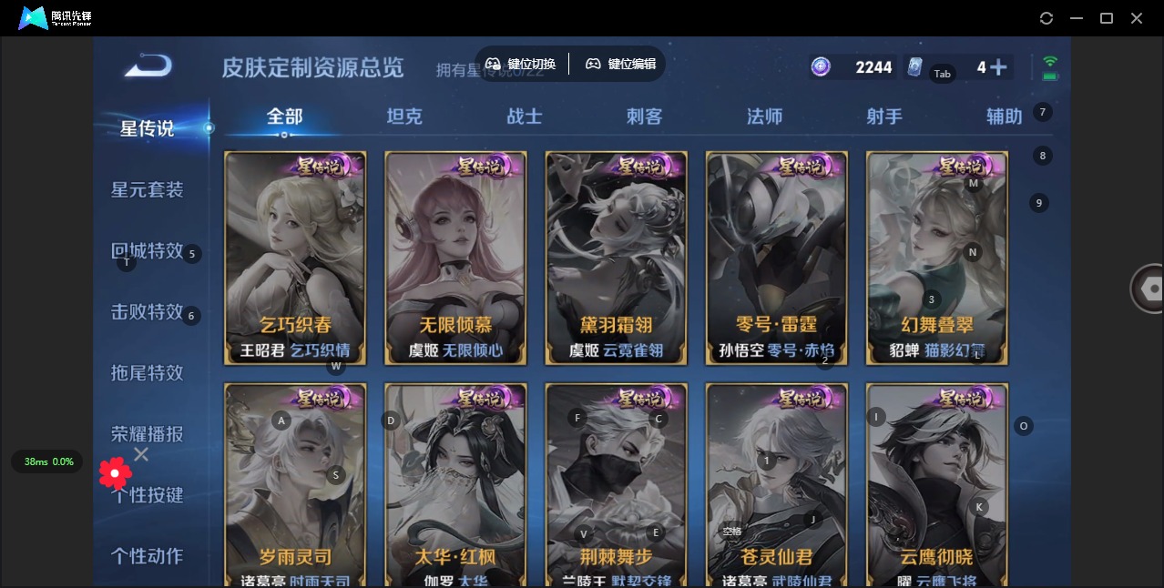 曹操天狼征服者,苏烈玄武志,赵云龙胆,典韦岱宗,项羽霸王别姬,露娜一生所爱,庄周玄嵩,公孙离蜜橘之夏,裴擒虎李小龙,东皇太一逐梦之光,上官婉儿梁祝,花木兰瑞麟志,花木兰青春决赛季,桑启鸣野蒿,孙悟空大圣娶亲,孙悟空至尊宝,百里玄策白虎志,韩信逐梦之影,蔡文姬奇迹圣诞,王昭君凤凰于飞,关羽武圣,关羽冰锋战神