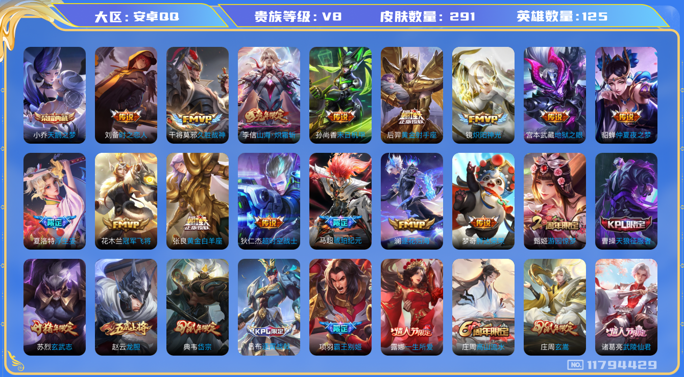 [11794429]V8 1典藏 21传说 125英雄 291皮肤 可修改实名 优质装备:天鹅之梦(小乔典藏),黄金射手座,冠军飞将,黄金白羊座,久胜战神,炽阳神光,末日机甲-孙尚香(绿蚂蚱),仲夏夜之梦(大飞蛾),地狱之眼,胖达荣荣,时之恋人-刘备(电焊工),超时空战士-狄仁杰,山海·炽霜斩(李信年限),浮生妄,澜逐花归海,琥珀纪元马超 珍宝阁皮:妄想食味,胡桃夹子 限定皮:逐霄战戟,鸣野蒿,至尊宝,白虎志(电光耗子),凤求凰(白切鸡),凤凰于飞,武陵仙君(小桃花),玄嵩(庄周年限),瑞麟志(木兰年限),遇见飞天,高山流水,五谷丰年,冰锋战神,武圣,游园惊梦,梁祝,龙胆,岱宗(典韦年限),天狼征服者,李小龙,逐梦之影,逐梦之光,玄武志(苏烈年限),霸王别姬-项羽,奇迹圣诞,一生所爱,大圣娶亲,青春决赛季,蜜橘之夏 史诗皮:化蝶舞,战舞者,琥珀纪元伽罗,蔬乡物语(鲁班七号),百相守梦-黄忠,遇见神鹿,紫霞仙子,电玩小子(小书包),白龙吟,黄金分割率,特工魅影,千年之狐,江河有灵,百解令(蒙犽),高渐离燃音魔法,暗夜猫娘,猫狗日记-孙策,乱世虎臣,节奏热浪,女仆咖啡,摇滚巨星,水果甜心,绅士熊喵,星夜王子,心灵骇客,功夫厨神,德古拉伯爵,暗隐猎兽者,幽灵船长,鬼剑武藏,暗渊魔法,心灵战警,舞动绿茵,地狱岩魂,纤云弄巧,繁星吟游(呼啦呼啦),拒霜思,缤纷独角兽,乘风破浪,逐浪之夏,水晶猎龙者,曙光守护者,箭羽风息,金属风暴,原初追逐者,圣诞狂欢,圣诞恋歌,鹰眼统帅,暗夜贵公子,魅力维加斯,无心,未来纪元-赵云