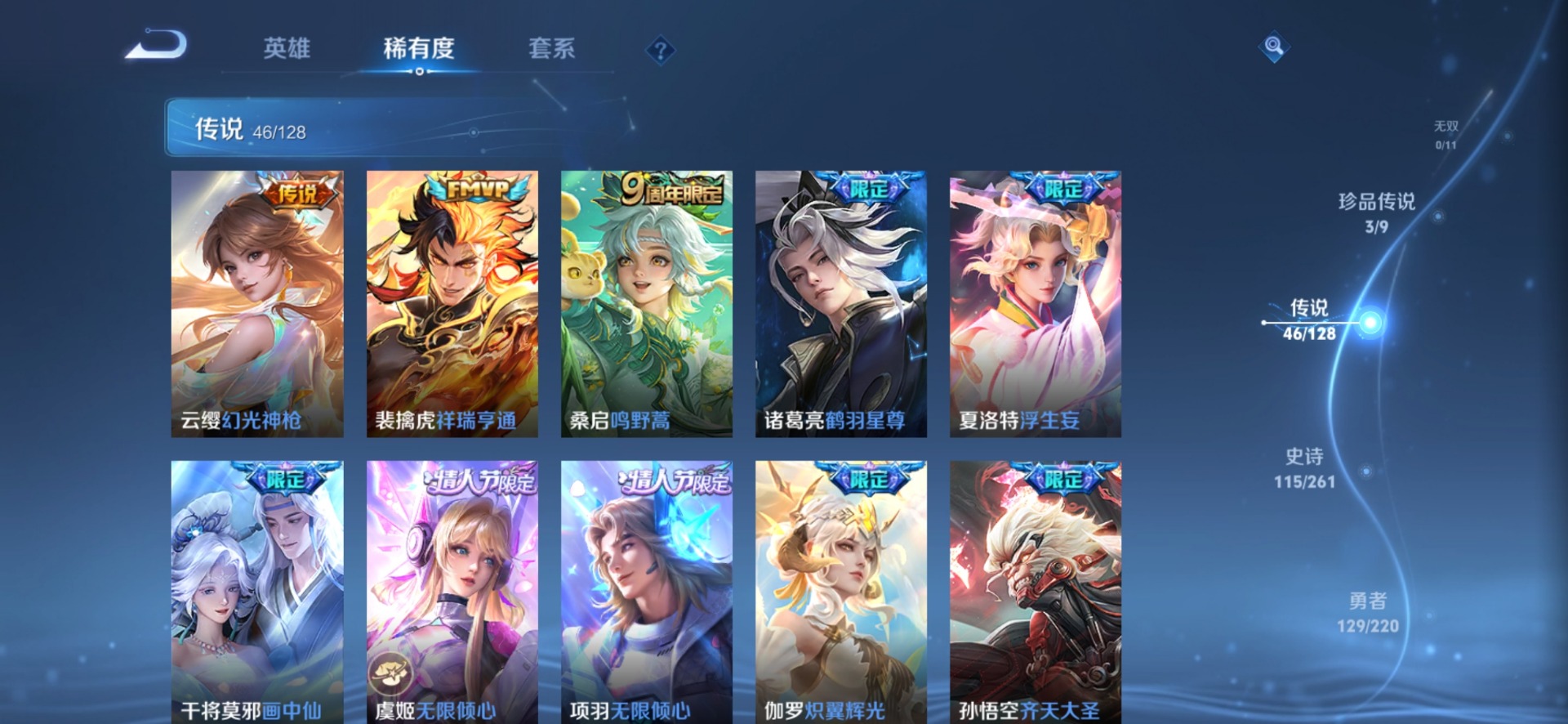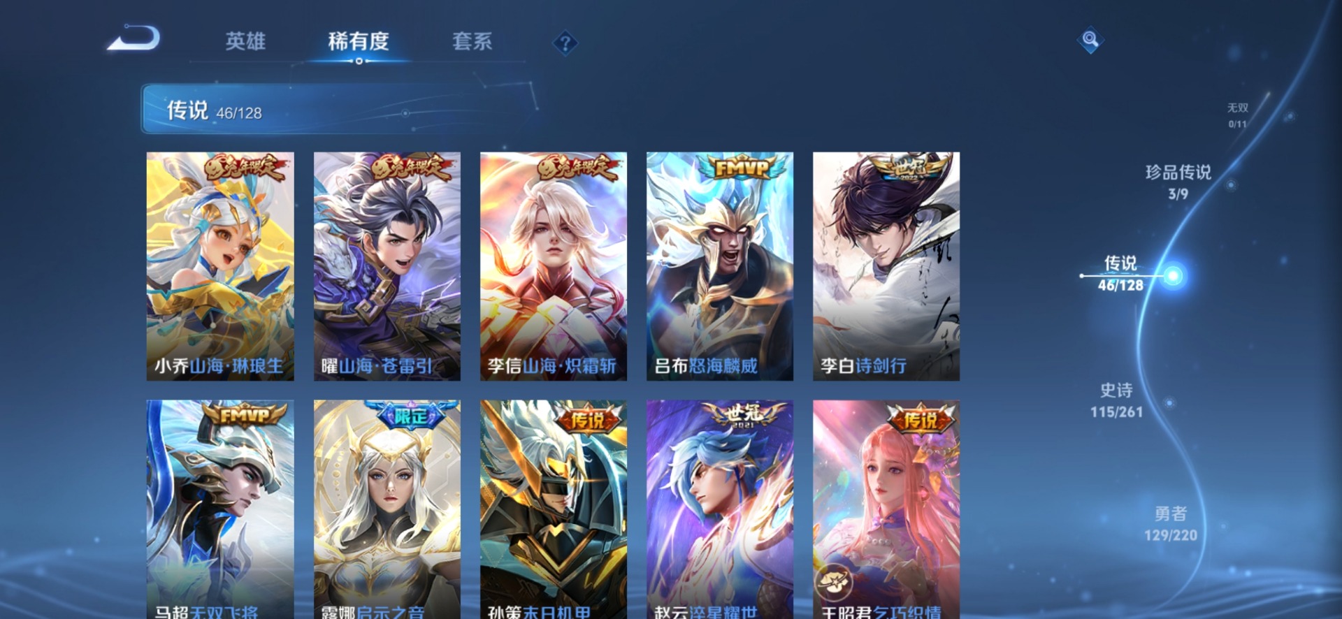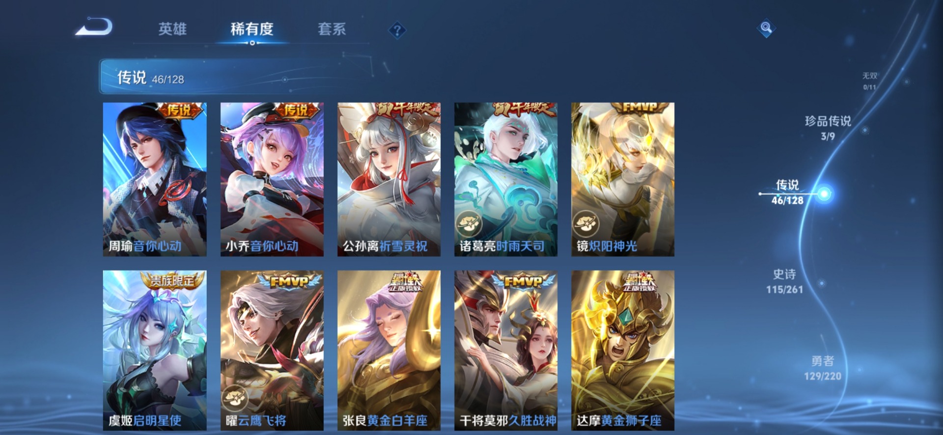 金蝉唐三藏,黄忠烈魂,伽罗天狼溯光者,张飞虎魄,赵云龙胆,小乔纯白花嫁,吕布御风骁将,露娜启示之音,庄周云端筑梦师,周瑜真爱至上,诸葛亮时雨天司,公孙离祈雪灵祝,司空震愿照·山河定,貂蝉逐梦之音,裴擒虎李小龙,上官婉儿梁祝,李白诗剑行,花木兰瑞麟志,安琪拉魔法小厨娘,马可波罗山海·玄木吟,桑启鸣野蒿,猪八戒猪悟能,女娲愿照·千秋盛,孙悟空孙行者,孙悟空至尊宝,马超神威,雅典娜神奇女侠,赵云引擎之心,盘古冰霜神祇,妲己愿照·众生和,百里守约朱雀志,墨子降魔,蔡文姬愿照·福禄聚,瑶山海·碧波行,澜愿照·九州拓,虞姬愿照·岁时盈,关羽冰锋战神