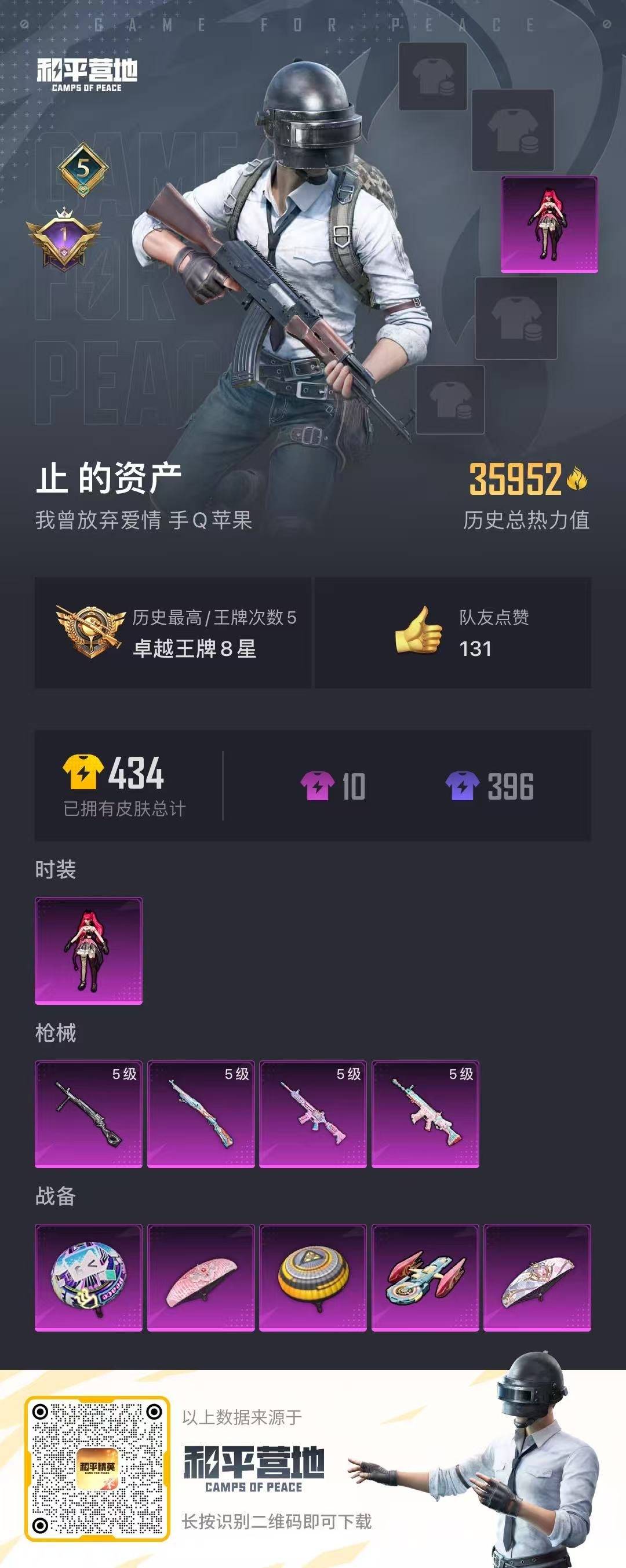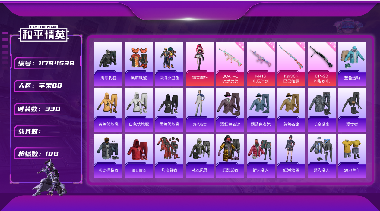 [11794538]1粉装 4特效枪 5印记 可二次 可修改实名 优质装备:SCAR-L-锦绣绵绵,M416电玩时刻,绯穹魔姬,Kar98K-巳巳如意 热门装扮:鹰眼刺客,呆萌铁蟹,深海小丑鱼 稀有枪皮:DP-28-豹影疾电 五级特效枪:五级Kar98K-巳巳如意,五级DP-28-豹影疾电,五级M416-电玩时刻,五级SCAR-L-锦绣绵绵 紫色装扮:SS31特训套装,旭日情侣,SS30特训套装,云朵鹅,彩虹兔,雪绒豹,SS33特训套装,顶瓜瓜,灵公主,酒红色名流,长空猛禽,霓虹街区,缤纷果语,蓝彩潮人,蓝色运动,街头潮人,无面战甲,绛羽幽主,魅力单车,鹤鸣,黄色伏地魔,黄色名流,黑色伏地魔,龟仙人,龙魂突击队,蝶变,香桃花海,海岛探路者,深蓝色名流,幻影武者,湖蓝色名流,白色伏地魔,破晓战魂,破蛋小黄鸡,空岛之星,灼焰舞者,SS29特训,狂花道·娜可露露,星途旅人,创世·幻影,白光莹,纯真浪花,热情海星,曼妙人鱼,SS28特训,卖崽青蛙,奶油梦幻熊,红潮炫舞,鱼渊荷华,燕燕于飞,巳巳如意,青团波波,糖糖葫芦,竞技名士,情公主,焰鹰斗篷,幻羽潜行,幽夜迷踪,SS27特训,蝶吟花词,小丑鱼,SS26特训,大橘大利,耀粉歌者,SS32特训服(SS32特训套装),青玉碎影,绯格组合,白糯汤圆,恋语绒绒,漫步者,冰冻风暴 优质战备:创世·救赎降落伞,精灵梦叶罗丽降落伞,星途旅人降落伞,幻彩电音降落伞,临安公主降落伞