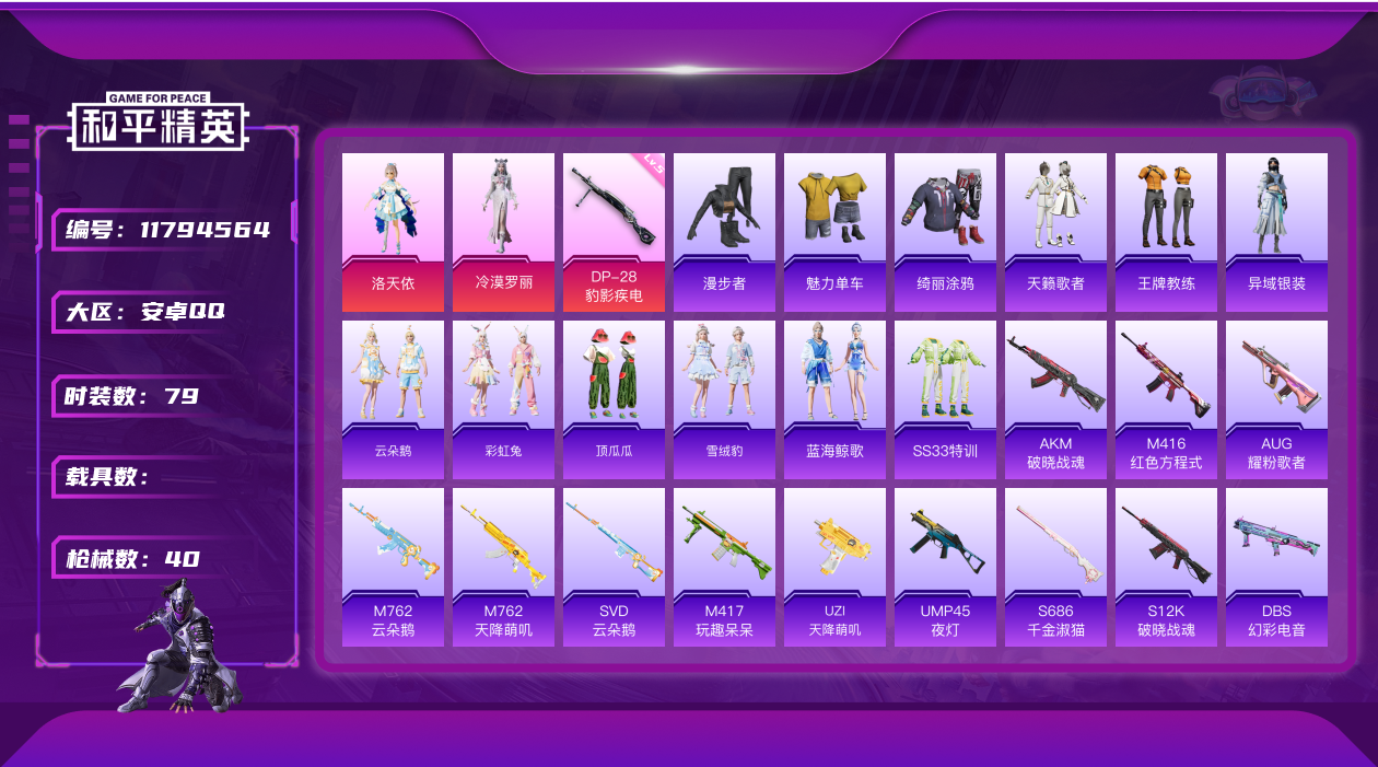 [11794564]2粉装 1特效枪 可二次 可修改实名 优质装备:洛天依,冷漠罗丽 稀有枪皮:DP-28-豹影疾电 五级特效枪:五级DP-28-豹影疾电 紫色装扮:云朵鹅,彩虹兔,雪绒豹,SS33特训套装,顶瓜瓜,天籁歌者,蓝海鲸歌,魅力单车,绮丽涂鸦,王牌教练,异域银装,漫步者 优质战备:圣堂之誓降落伞,喜羊羊与灰太狼降落伞,洛神天依降落伞