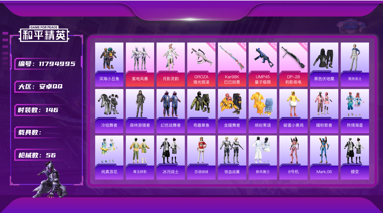 [11794995]2粉装 4特效枪 1印记 可二次 可修改实名 连体王者 身法装备:8号机(新粉螳螂),Mark.06(新蓝螳螂) 优质装备:UMP45量子极限,GROZA-镜光银凌,月影灵韵,Kar98K-巳巳如意 热门装扮:紫电风暴,深海小丑鱼 稀有枪皮:DP-28-豹影疾电 五级特效枪:五级UMP45-量子极限,五级GROZA-镜光银凌,五级Kar98K-巳巳如意 一级特效枪:一级DP-28-豹影疾电 紫色装扮:SS31特训套装,冷焰舞者,缤纷果语,黑色伏地魔,冰河战士,蝶变,幻世战舞者,破蛋小黄鸡,福星高照,雏菊兔兔,萝兰蝴蝶,SS29特训,星途旅人,纯真浪花,热情海星,SS28特训,铁血战翼,8号机(新粉螳螂),Mark.06(新蓝螳螂),鱼渊荷华,燕燕于飞,巳巳如意,森林游猎者,竞技名士,许七安,智谋强哥,奇趣章鱼,耀粉歌者,蓝冰羽,SS32特训服(SS32特训套装),青玉碎影,新风雅兰,恋语绒绒,金耀舞者 优质战备:守护天翼降落伞,创世·救赎降落伞,公主华盖飞行器,金丰海韵降落伞,临安公主降落伞,百万伏特降落伞