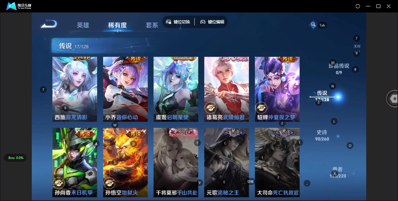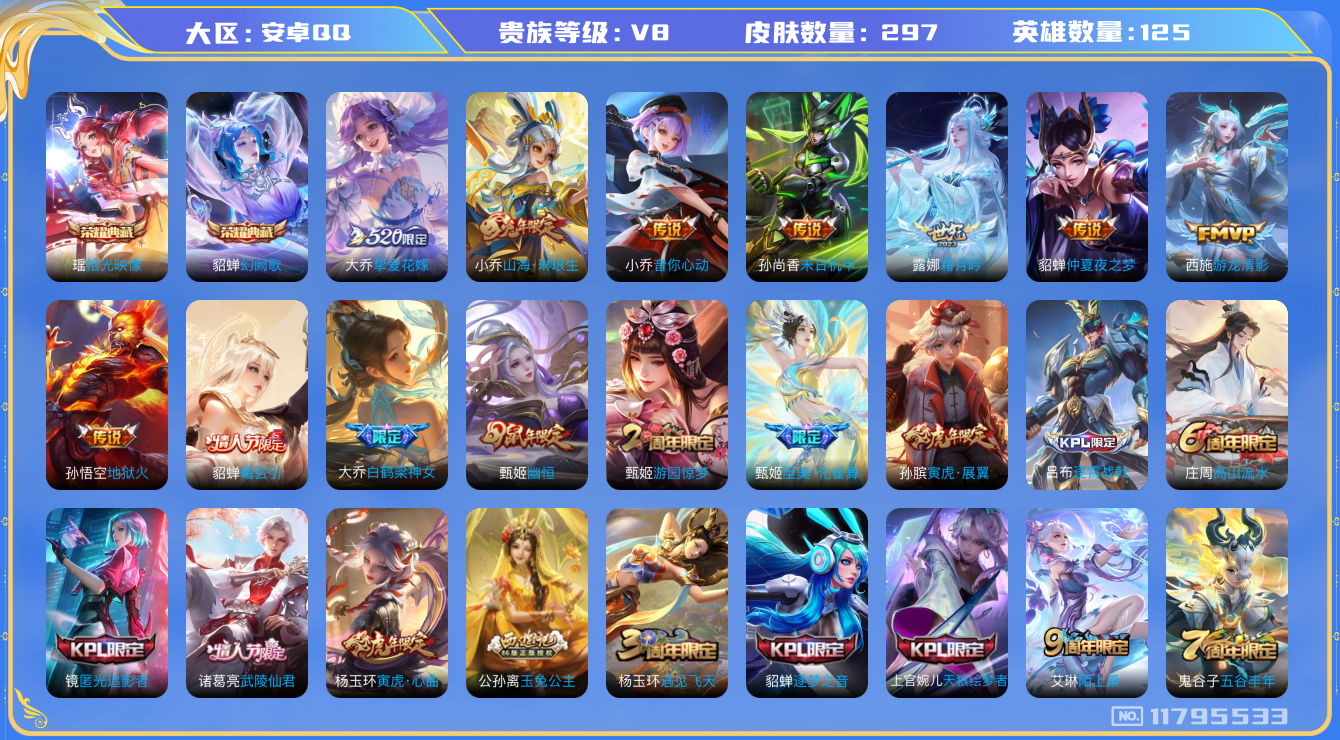 [11795533]V8 2典藏 17传说 125英雄 297皮肤 可修改实名 优质装备:幻阙歌(貂蝉典藏),拾光映像(瑶典藏),末日机甲-孙尚香(绿蚂蚱),地狱火,仲夏夜之梦(大飞蛾),音你心动-小乔,游龙清影(小青龙),挚爱花嫁,山海·琳琅生(小乔年限),霜月吟,涂山容容 传说皮:貂蝉曦玄引 珍宝阁皮:胡桃夹子,万物之道,蔷薇恋人 限定皮:愿照·岁时盈(虞姬年限),愿照·众生和(妲己年限),逐霄战戟,陌上桑,鸣野蒿,武陵仙君(小桃花),傲雪梅枪,补天,寅虎·展翼(孙膑年限),白鹤梁神女,山海·碧波行(瑶年限),至美·乘鲤谣,至美·化雀舞,遇见飞天,高山流水,五谷丰年,幽恒(沐浴露),游园惊梦,逐梦之音,天狼绘梦者,如梦令-嫦娥,热情桑巴,匿光追影者,寅虎·心曲(虎婆),时之祈愿-瑶(瑶传限),玉兔公主 史诗皮:化蝶舞,星界战将,茶境仙,涂山红红,东方月初,乘龙·聚宝船(安琪拉年限),遇见神鹿,紫霞仙子,电玩小子(小书包),特工魅影,千年之狐,江河有灵,匿光侦查者,雪夜绮愿(周瑜),魅语,百解令(蒙犽),蒙恬荣光圣徽,无限星赏官,冰冠公主,偶像歌手,晚萤,电玩·爆裂旋风,末日机甲-吕布,猫狗日记-孙策,猫狗日记-大乔,时之恋人-孙尚香,乱世虎臣,节奏热浪,女仆咖啡,摇滚巨星,水果甜心,绅士熊喵,星夜王子,心灵骇客,功夫厨神,德古拉伯爵,暗隐猎兽者,幽灵船长,鬼剑武藏,心灵战警,舞动绿茵,诗语江南,纤云弄巧,繁星吟游(呼啦呼啦),拒霜思,缤纷独角兽,乘风破浪,逐浪之夏,月团寄思,唤灵魅影,金属风暴,原初追逐者,圣诞恋歌,鹰眼统帅,魅力维加斯,黎明之约,奇遇舞章,无心,未来纪元-赵云