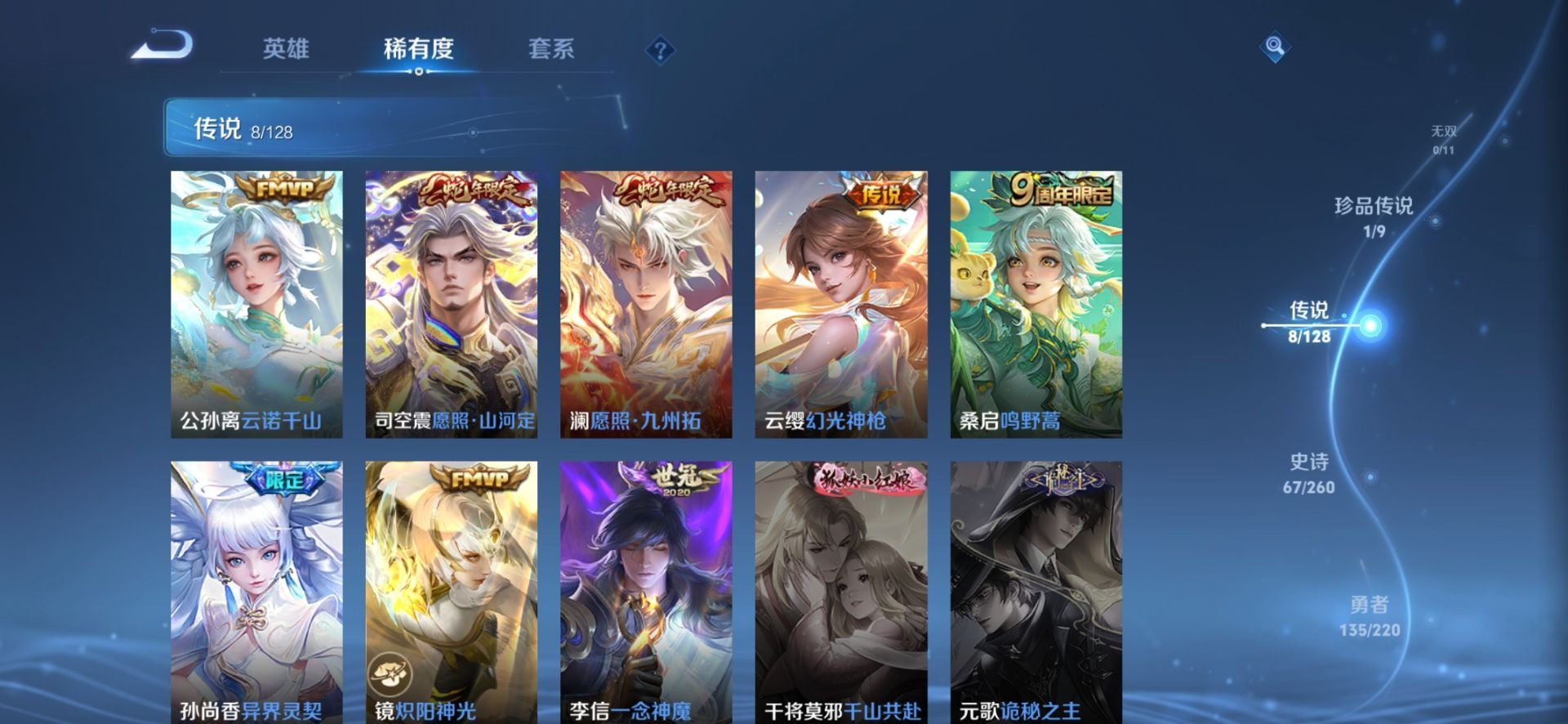 - PX_2082811-贵族等级: V5 英雄数: 121 皮肤数: 101 星传说: 幽冥之眼 传说皮: 黄金射手座,冠军飞将,云鹰飞将,澜逐花归海 限定皮: 游园惊梦,白鹤梁神女,蜜橘之夏,凤求凰,高山流水,寅虎·心曲