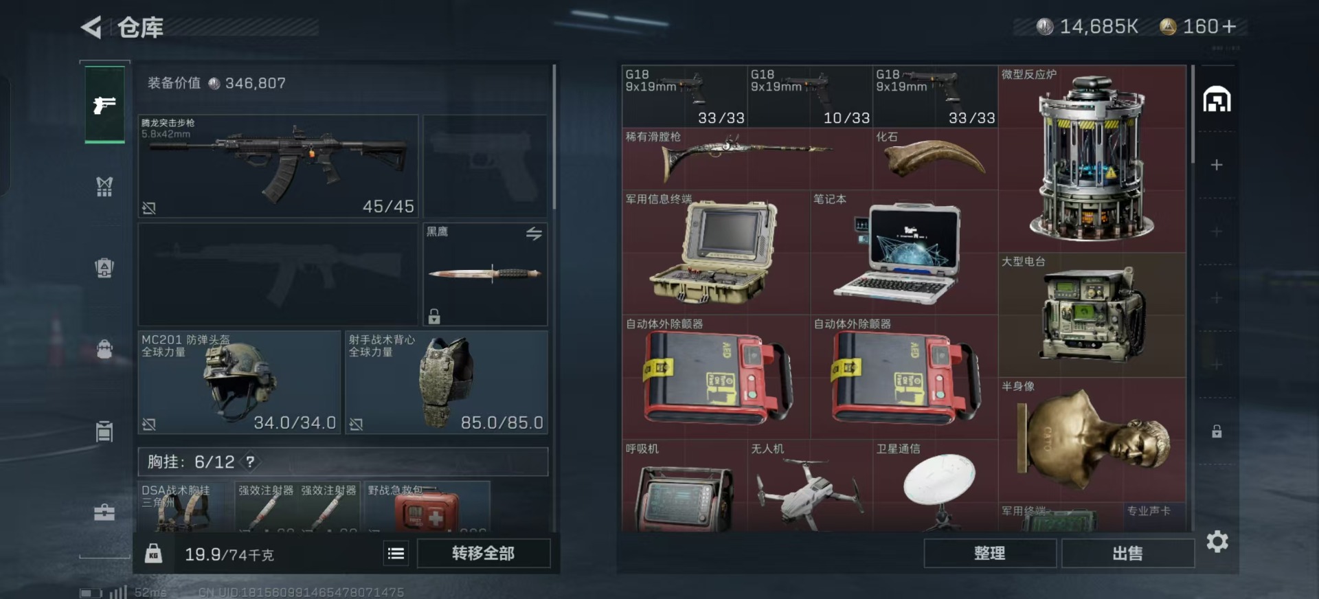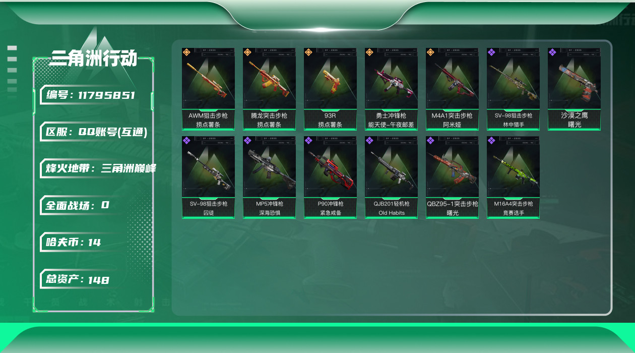 [11795851]总资产:148.2M 5传说枪械 哈夫币:14.685K 可二次 可修改实名 烽火地带段位:三角洲巅峰 全面战场段位:无段位 传说武器皮肤:AWM狙击步枪-捞点薯条,腾龙突击步枪-捞点薯条,93R-捞点薯条,勇士冲锋枪-能天使-午夜邮差,M4A1突击步枪-阿米娅 史诗武器皮肤:QJB201轻机枪-Old Habits,MP5冲锋枪-深海恐惧,M16A4突击步枪-竞赛选手,SV-98狙击步枪-林中猎手,SV-98狙击步枪-囚徒,QBZ95-1突击步枪-曙光,沙漠之鹰-曙光,P90冲锋枪-紧急戒备