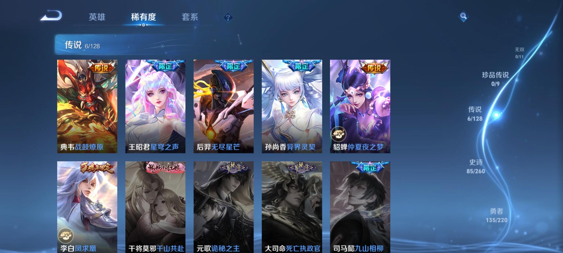 伽罗天狼溯光者,孙尚香异界灵契,后羿无尽星芒,裴擒虎李小龙,上官婉儿梁祝,上官婉儿神器·万象笔,安琪拉魔法小厨娘,猪八戒猪悟能,孙悟空孙行者,孙悟空大圣娶亲,孙悟空至尊宝,孙悟空美猴王,王昭君星穹之声,关羽冰锋战神