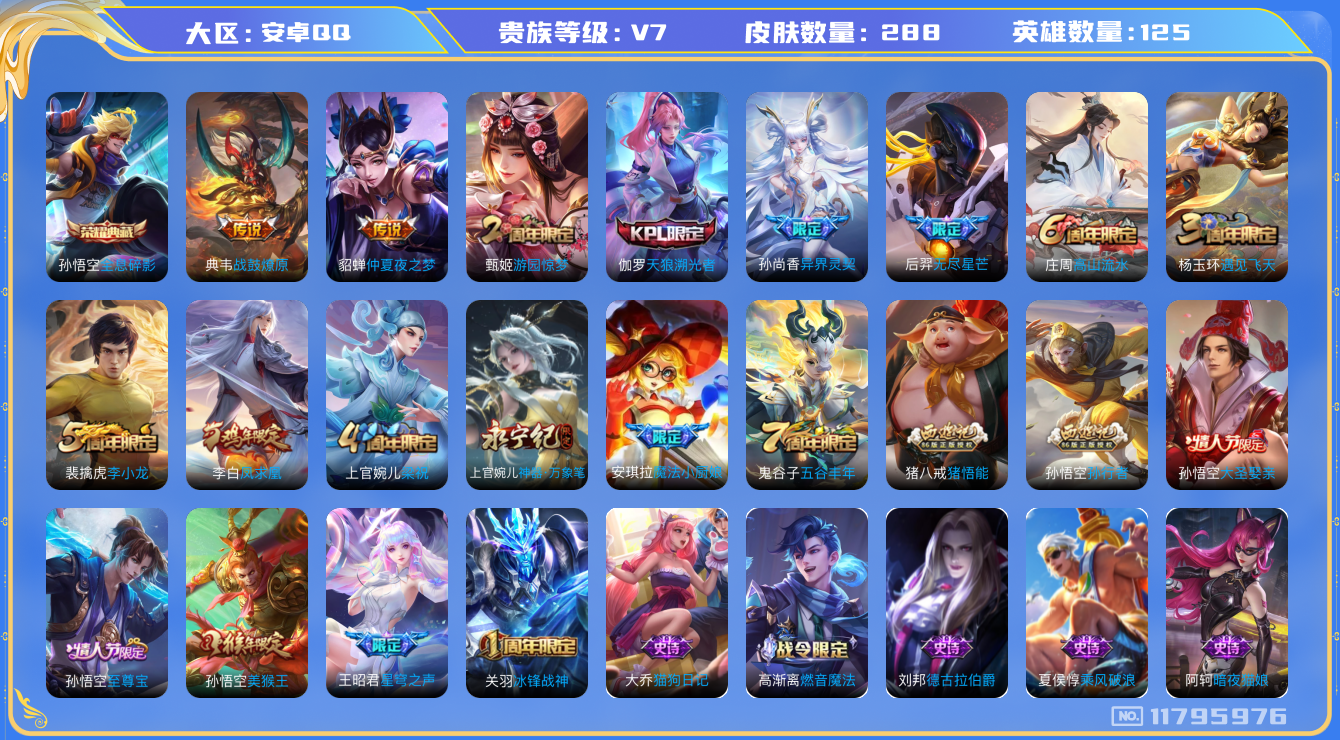 [11795976]V7 1典藏 6传说 125英雄 288皮肤 可修改实名 优质装备:全息碎影(猴子典藏),仲夏夜之梦(大飞蛾) 传说皮:典韦战鼓燎原 珍宝阁皮:优雅恋人,蔷薇恋人,玩趣恶龙 限定皮:至尊宝,凤求凰(白切鸡),异界灵契(白毛香),星穹之声,魔法小厨娘,遇见飞天,高山流水,五谷丰年,冰锋战神,游园惊梦,梁祝,天狼溯光者,李小龙,孙行者,猪悟能,大圣娶亲,美猴王,无尽星芒,神器·万象笔 史诗皮:怒海争锋,遇见神鹿,紫霞仙子,电玩小子(小书包),黄金分割率,特工魅影,千年之狐,江河有灵,百解令(蒙犽),高渐离燃音魔法,匿光破解者,冰冠公主,青蛇,百相守梦(刘备),暗夜猫娘,龙骑士(小龙虾),猫狗日记-孙策,猫狗日记-大乔,乱世虎臣,节奏热浪,修罗,女仆咖啡,摇滚巨星,水果甜心,绅士熊喵,天才门将,星夜王子,心灵骇客,功夫厨神,德古拉伯爵,暗隐猎兽者,幽灵船长,鬼剑武藏,心灵战警,舞动绿茵,地狱岩魂,纤云弄巧,繁星吟游(呼啦呼啦),拒霜思,缤纷独角兽,乘风破浪,逐浪之夏,水晶猎龙者,曙光守护者,箭羽风息,金属风暴,圣诞狂欢,圣诞恋歌,鹰眼统帅,暗夜贵公子,魅力维加斯,无心,未来纪元-赵云