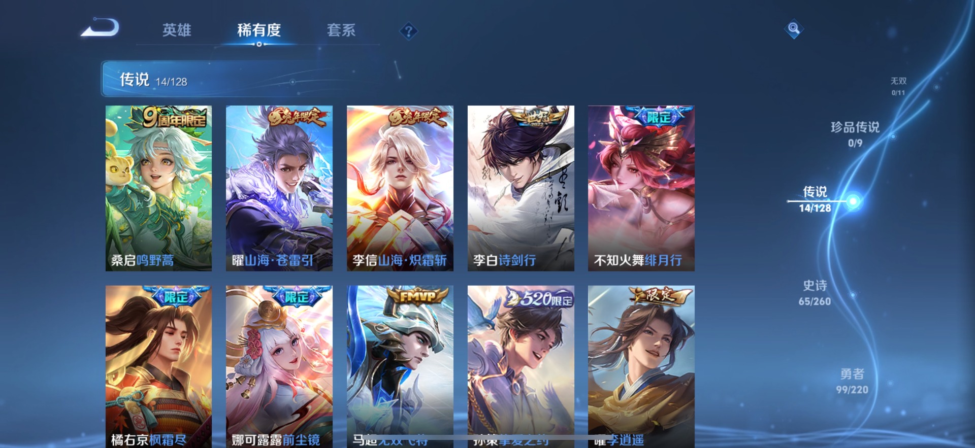 - PX_2089901-贵族等级: V6 英雄数: 124 皮肤数: 149 珍品传说: 怪盗基德 星传说: 星际治安官 传说皮: 云鹰飞将,超时空战士-狄仁杰,典韦战鼓燎原,幻光神枪 限定皮: 高山流水,匿光启智者,五谷丰年,鸣野蒿,愿照·九州拓