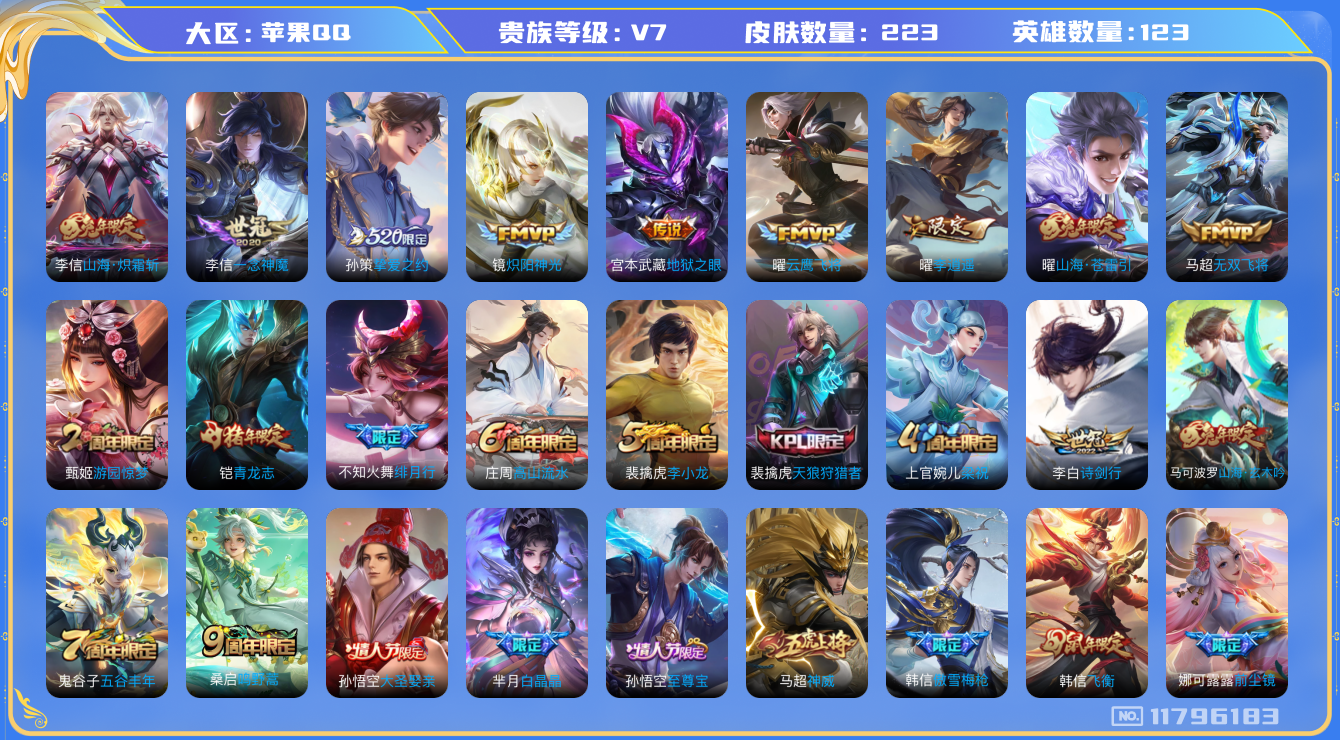 - [11687163]V7 1典藏 8传说 124英雄 268皮肤 可修改实名 优质装备:鸣剑·曳影,猫影幻舞,炽阳神光,地狱火,仲夏夜之梦(大飞蛾) 珍宝阁皮:女武神 限定皮:至尊宝,白虎志(电光耗子),凤求凰(白切鸡),太华(伽罗年限),梅西,武陵仙君(小桃花),时之彼端,神威(电光马子),飞衡(韩信年限),五谷丰年,冰锋战神,梁祝,天狼狩猎者,逐梦之翼,逐梦之星,天狼征服者,天狼绘梦者,逐梦之影,逐梦之光,辉光之辰,一生所爱,大圣娶亲,引擎之心,青春决赛季,冰霜恋舞曲,云端筑梦师,神奇女侠,美猴王 史诗皮:器灵·浮梦炉,化蝶舞,龙之律动,茶境仙,百相守梦-黄忠,紫霞仙子,电玩小子(小书包),白龙吟,黄金分割率,特工魅影,千年之狐,电玩·爆裂旋风,晚萤,末日机甲-吕布,猫狗日记-孙策,节奏热浪,水果甜心,天才门将,星夜王子,心灵骇客,功夫厨神,德古拉伯爵,暗隐猎兽者,幽灵船长,鬼剑武藏,心灵战警,乐园奇幻夜,舞动绿茵,地狱岩魂,繁星吟游(呼啦呼啦),缤纷独角兽,乘风破浪,逐浪之夏,水晶猎龙者,曙光守护者,箭羽风息,金属风暴,原初追逐者,圣诞狂欢,圣诞恋歌,鹰眼统帅,暗夜贵公子,魅力维加斯,黎明之约,赏金猎手,无心,未来纪元-赵云