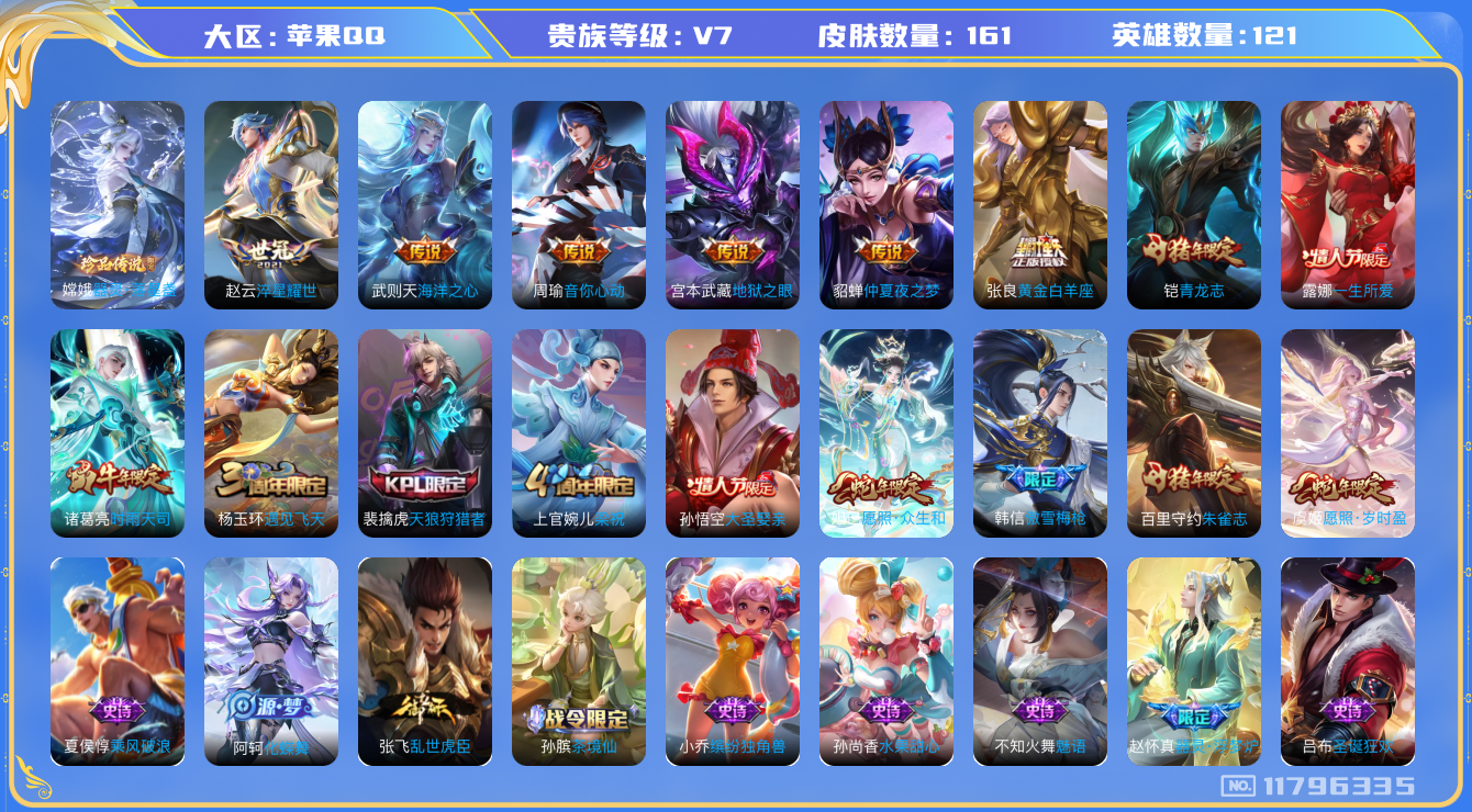 - [12063261]V7 1典藏 11传说 125英雄 280皮肤 可修改实名 优质装备:无限飓风号(高达),云鹰飞将(小将军),飞鸢探春,时之恋人-刘备(电焊工),超时空战士-狄仁杰,无双飞将,澜逐花归海,涂山容容 传说皮:九山相柳,幻光神枪 珍宝阁皮:妄想食味,优雅恋人 限定皮:愿照·岁时盈(虞姬年限),逐霄战戟,鸣野蒿,至尊宝,傲雪梅枪,时雨天司(水龙头),高山流水,五谷丰年,青龙志(铠年限),梁祝,李小龙,朱雀志(守约年限),孙行者,猪悟能 史诗皮:化蝶舞,龙之律动,百相守梦-周瑜,茶境仙,怒海争锋,破空之剑,东方月初,埋骨钱,芈月浮光幕影,蔬乡物语(鲁班七号),百相守梦-百里守约,紫霞仙子,白龙吟,黄金分割率,特工魅影,千年之狐,江河有灵,冰冠公主,青蛇,偶像歌手,末日机甲-吕布,猫狗日记-孙策,时之恋人-孙尚香,乱世虎臣,节奏热浪,修罗,女仆咖啡,水果甜心,心灵骇客,功夫厨神,暗隐猎兽者,幽灵船长,鬼剑武藏,心灵战警,舞动绿茵,地狱岩魂,纤云弄巧,缤纷独角兽,乘风破浪,逐浪之夏,月团寄思,水晶猎龙者,曙光守护者,箭羽风息,金属风暴,圣诞狂欢,圣诞恋歌,鹰眼统帅,无心,未来纪元-赵云