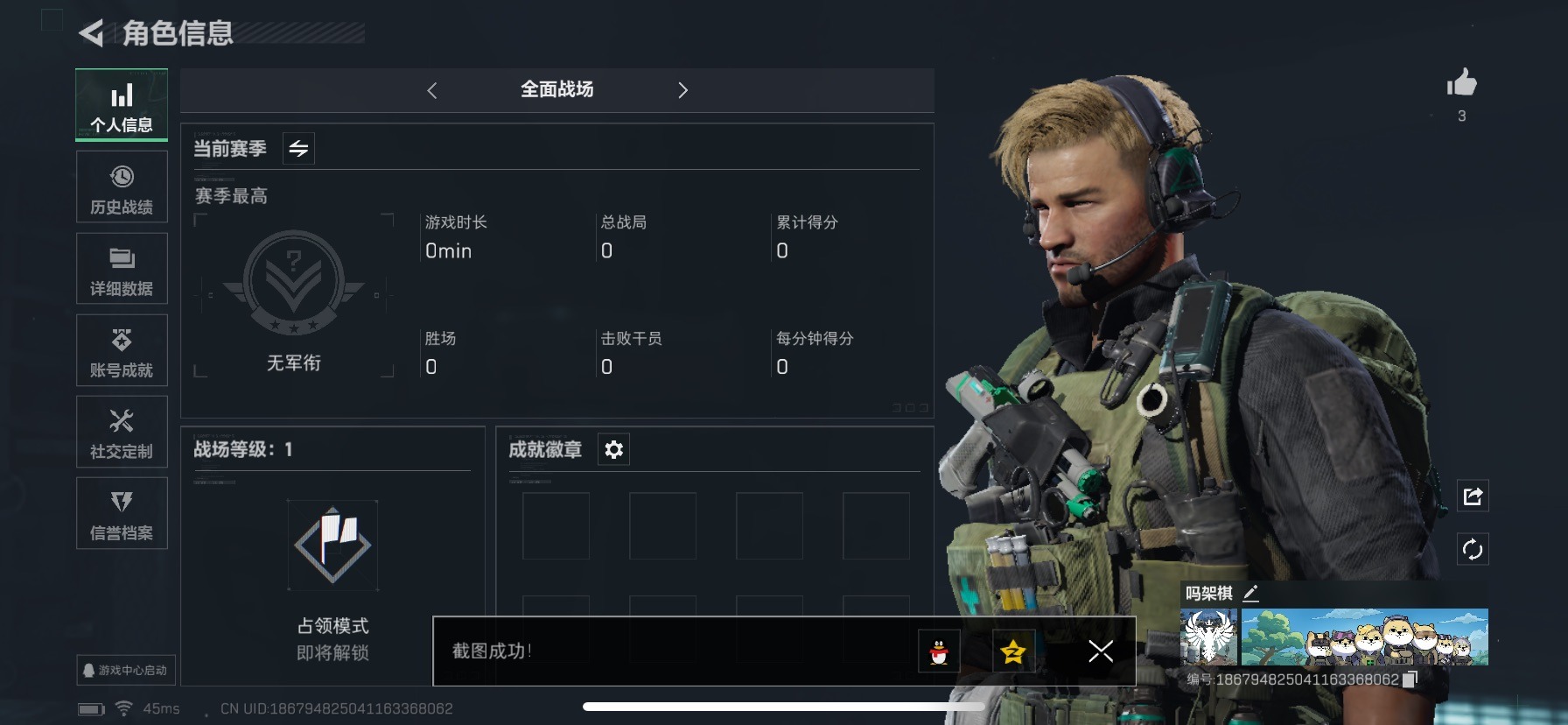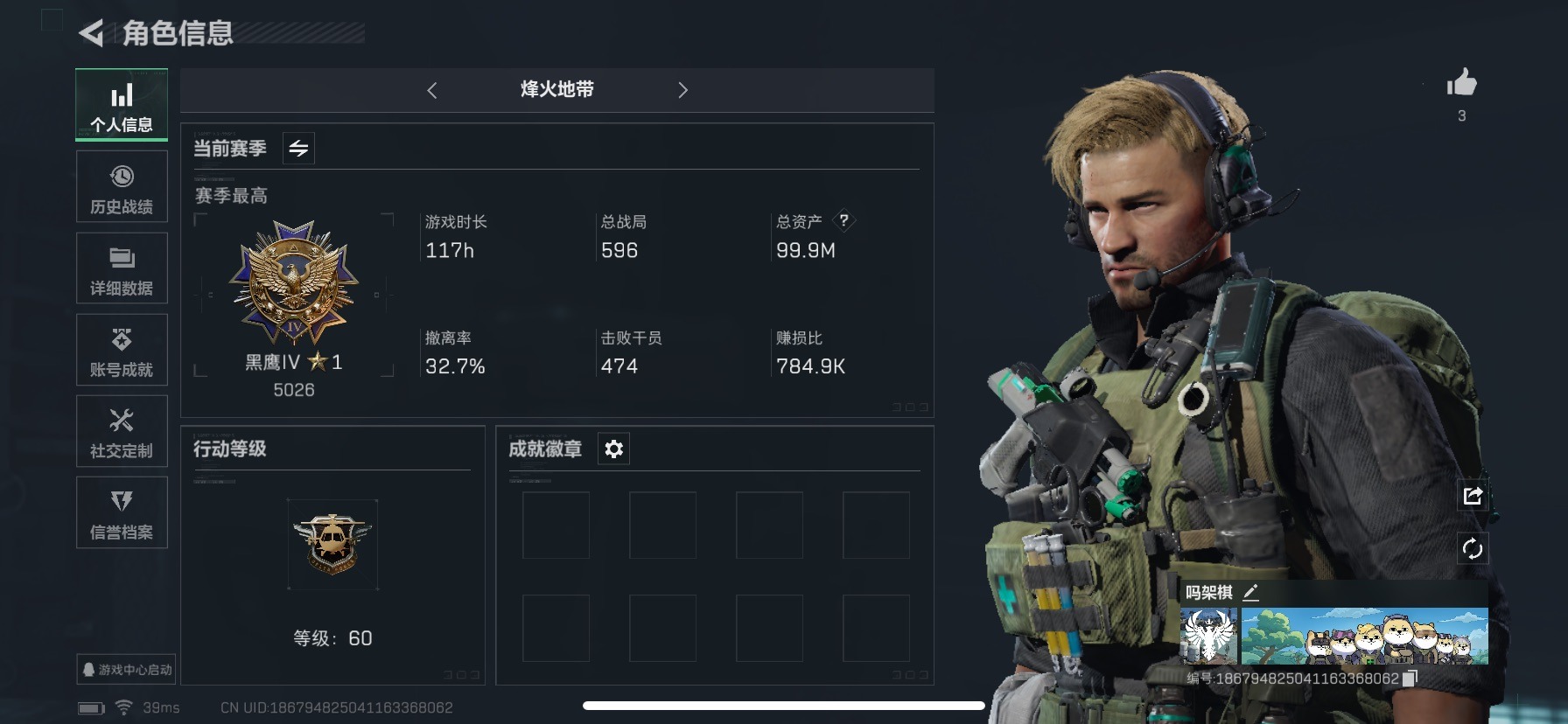 - [11685106]总资产:179M 1干员外观 1传说枪械 哈夫币:98.215K 高级安全箱(2×3)9.15号到期 可二次 可修改实名 烽火地带段位:钻石 全面战场段位:无段位 传说武器皮肤:M4A1突击步枪-阿米娅 干员外观:露娜-黑·天际线