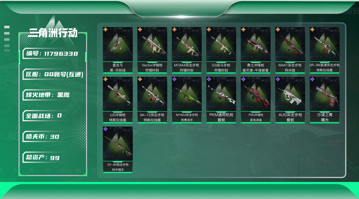 [11796338]总资产:99.9M 9传说枪械 哈夫币:30.423K 可二次 可修改实名 烽火地带段位:黑鹰 全面战场段位:无段位 传说武器皮肤:UZI冲锋枪-特斯拉线圈,M16A4突击步枪-狩猎时刻,AK-12突击步枪-特斯拉线圈,SR-3M紧凑突击步枪-特斯拉线圈,勇士冲锋枪-能天使-午夜邮差,Vector冲锋枪-狩猎时刻,G3战斗步枪-狩猎时刻,复合弓-黑-天际线,M4A1突击步枪-阿米娅 史诗武器皮肤:PKM通用机枪-蝮蛇,AUG突击步枪-蝮蛇,M16A4突击步枪-竞赛选手,SV-98狙击步枪-林中猎手,沙漠之鹰-曙光,P90冲锋枪-紧急戒备