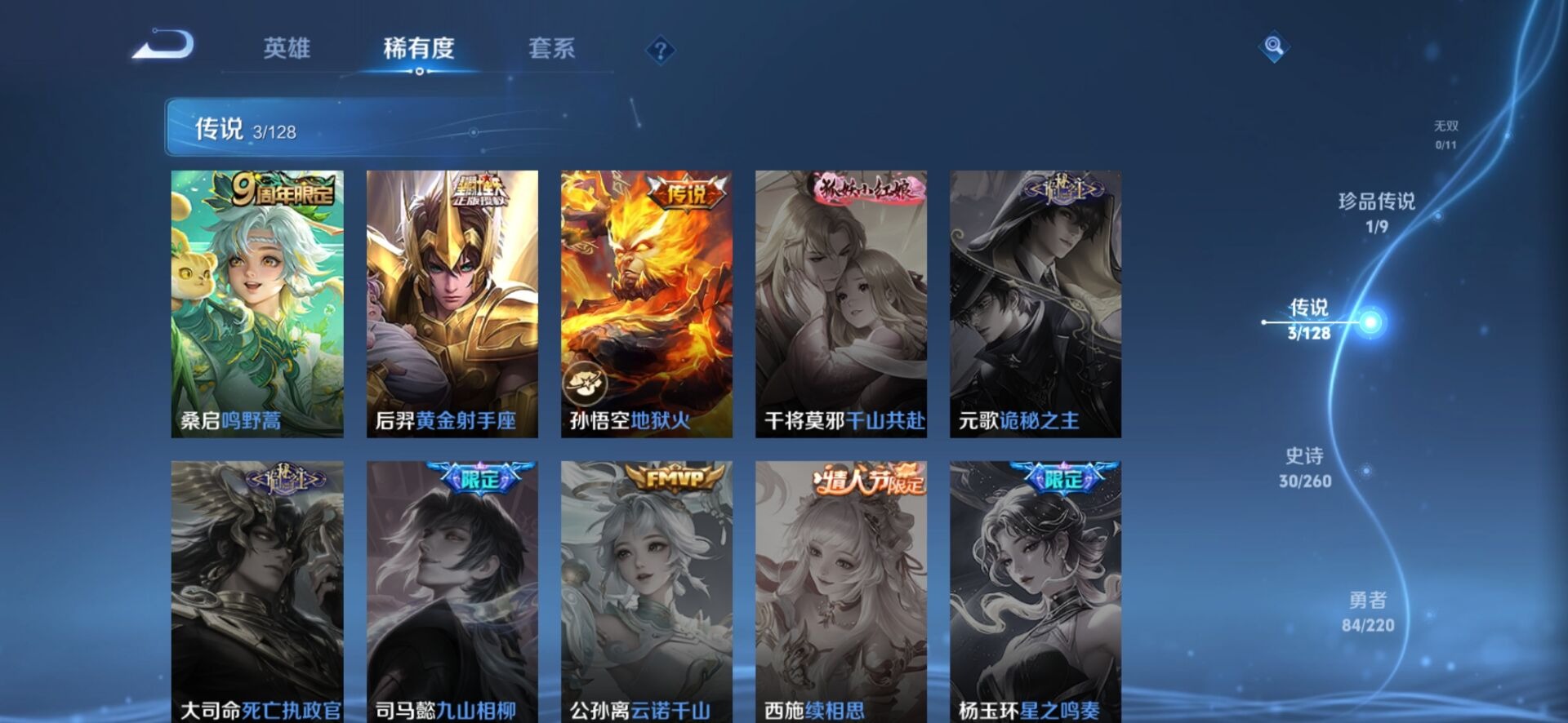 - PX_2086498-38 安卓QQ/绝世王者/261皮肤/124英雄/1典藏/0珍品无双/1无双/2珍品传说/17传说/72史诗/8稀有英雄 【2 珍品传说】黑崎一护 宫本武藏,器灵·落星盏 嫦娥, 【1 典藏皮肤】赤影疾锋 关羽, 【1 无双皮肤】器灵·螭龙剑 曜, 【17 传说皮肤】启明星使 虞姬,逐花归海 澜,地狱火 孙悟空,云鹰飞将 曜,齐天大圣 孙悟空,地狱之眼 宫本武藏,鹤羽星尊 诸