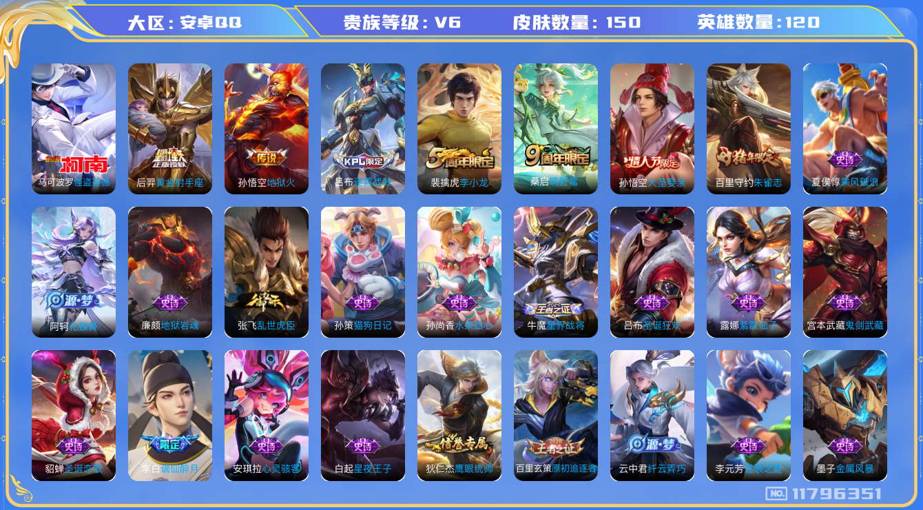 [11796351]V6 1珍品传说 3传说 120英雄 150皮肤 可修改实名 优质装备:怪盗基德,黄金射手座,地狱火 珍宝阁皮:玩趣恶龙 限定皮:逐霄战戟,鸣野蒿,李小龙,朱雀志(守约年限),大圣娶亲 史诗皮:化蝶舞,星界战将,谪仙醉月,紫霞仙子,偶像歌手,猫狗日记-孙策,乱世虎臣,修罗,水果甜心,星夜王子,心灵骇客,鬼剑武藏,地狱岩魂,纤云弄巧,繁星吟游(呼啦呼啦),乘风破浪,逐浪之夏,金属风暴,原初追逐者,圣诞狂欢,圣诞恋歌,鹰眼统帅,魅力维加斯