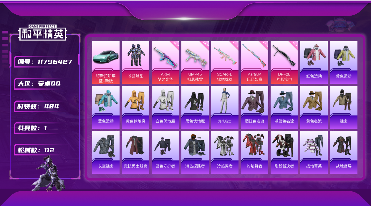 [11796427]1粉装 5特效枪 1载具 8印记 可二次 可修改实名 优质装备:特斯拉Roadster(水滴蓝),苍蓝魅影,UMP45相思残雪(UMP45-相思残雪),AKM梦之光华,SCAR-L-锦绣绵绵,七级AKM-梦之光华,七级UMP45-相思残雪,Kar98K-巳巳如意 稀有枪皮:DP-28-豹影疾电 五级特效枪:五级Kar98K-巳巳如意,五级SCAR-L-锦绣绵绵 一级特效枪:一级DP-28-豹影疾电 紫色装扮:SS22特训,SS21特训,SS31特训套装,SS2特训,SS3特训,SS4特训,人气偶像,决胜时刻,冷焰舞者,刚毅裁决者,北国孤狼,SS30特训套装,SS33特训套装,SS20特训,青春冒险家,潮流游乐家,SS15特训,暗夜傀儡,SS16特训,银白舞王,SS13特训,星梦畅游,SS14特训,萌趣颜团子,特种颜团子,微雨春柳,暖风夏荷,飞驰魅影,音速流光,SS19特训,吉莉礼服,SS17特训,SS18特训,阳光火鸡,都市漫游者,都市魅力,酒红色名流,长空猛禽,霓虹街区,迎春赐吉,缤纷果语,耀眼新星,蓝彩潮人,蓝色守护者,蓝色运动,虎虎生威吉莉,街头潮人,飞行日记,魅力单车,鹤鸣,麻辣教官,黄色伏地魔,黄色名流,黄色运动,黑色伏地魔,龙的传人,龟仙人,冰河战士,龙魂突击队,蝶变,极速红龙,沙漠兵团,海岛探路者,海滨突袭者,深蓝色名流,幻影武者,坚韧舞者,夏日音浪,夜莺强袭者,完美偶像,帅气教官,幻世战舞者,怒火燎原,战地督导,战地菁英,湖蓝色名流,绮丽涂鸦,疯狂小兔子,白熊同盟,白色伏地魔,破晓战魂,破蛋小黄鸡,福星高照,空岛之星,空投萌叽,竞技勇士朋克,竞技达人朋克,红色运动,牛气冲天,灼焰舞者,炫蓝之夏,热血青春,燃烧卡路里,牛气满满,猛禽,镭射皇者,SS29特训,纯真浪花,热情海星,SS28特训,创世·追猎,鱼渊荷华,玉兔迎春,竞技名士,SS25特训,焰鹰斗篷,幻羽潜行,SS27特训,SS26特训,SS6特训,大橘大利,SS10特训,耀粉歌者,春日漫步,蓝冰羽,紫幽梦,SS32特训服(SS32特训套装),绯格组合,萌黄之夏,蜜桃派对,恋语绒绒,双彩圣灵 优质战备:星之彼岸降落伞,樱桃泡泡降落伞,飞行器-庄周梦蝶,四圣焕新降落伞,相思残雪降落伞,怪笑疯兔降落伞,洛神天依降落伞