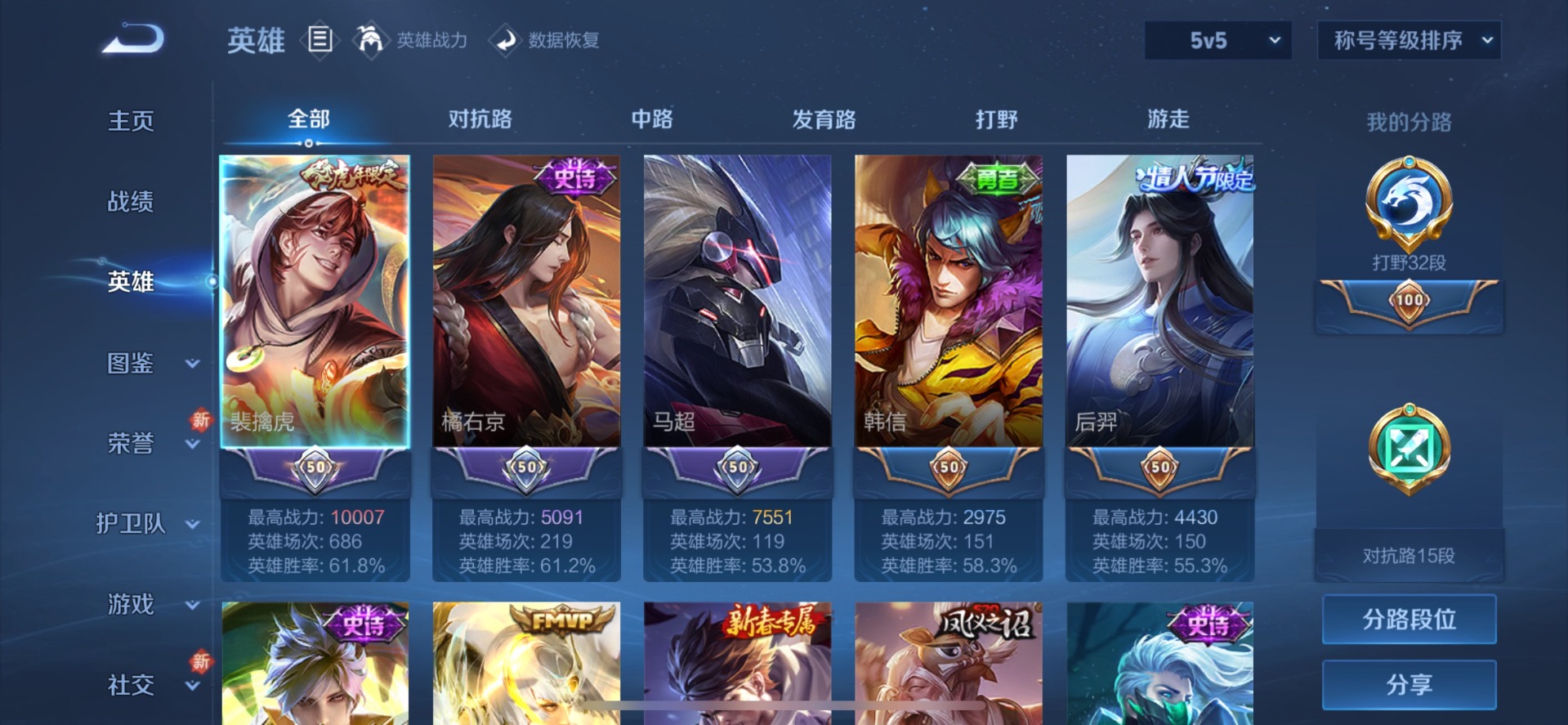 - PX_2080973-实名: 不可修改 贵族等级: V3 英雄数: 98 皮肤数: 104 传说皮: 花朝如约 限定皮: 游园惊梦,鸣野蒿,逐霄战戟
