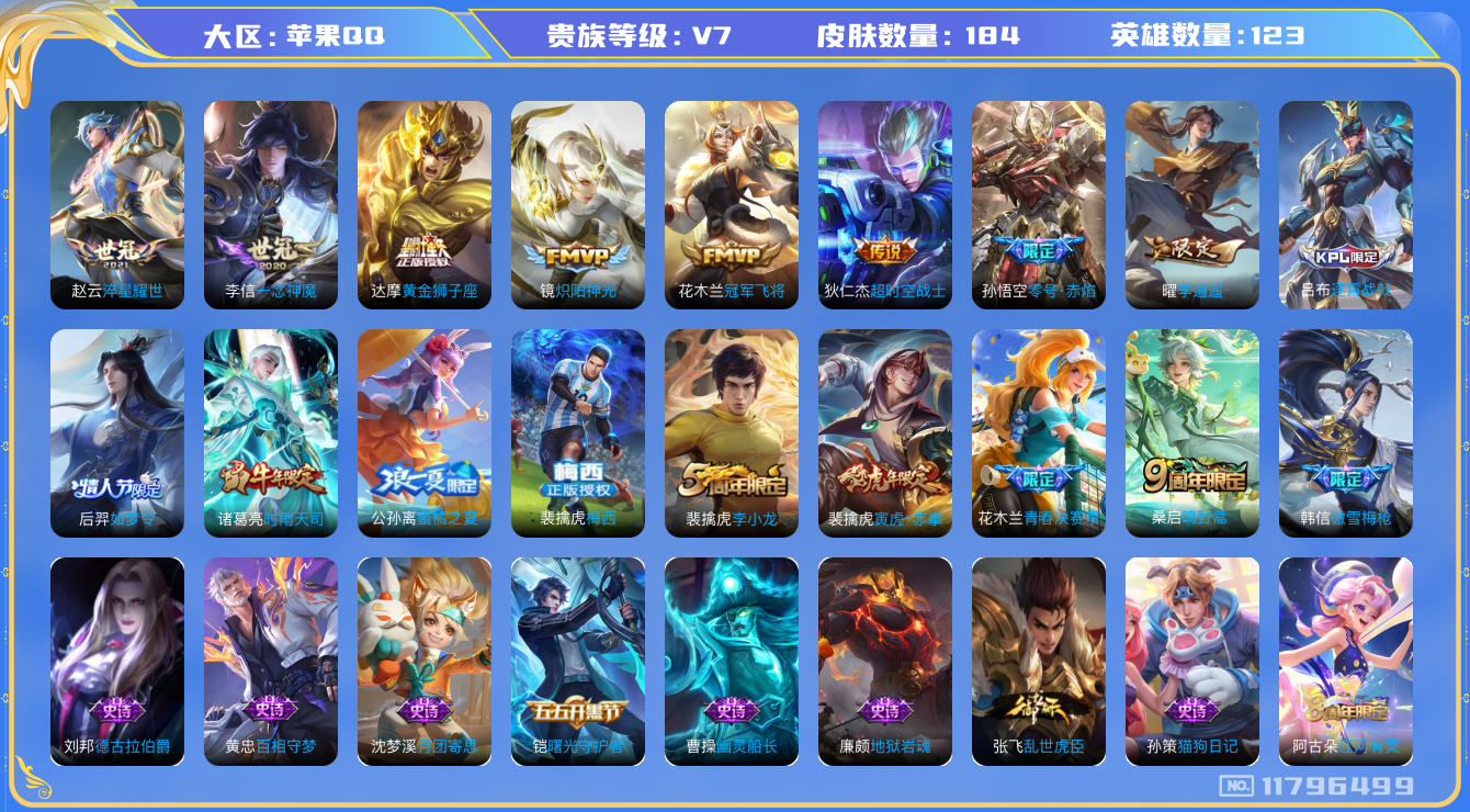 [11796499]V7 11传说 123英雄 184皮肤 可修改实名 优质装备:黄金狮子座,冠军飞将,炽阳神光,一念神魔,零号·赤焰,李逍遥,淬星耀世,超时空战士-狄仁杰,涂山容容 珍宝阁皮:妄想食味 限定皮:逐霄战戟,鸣野蒿,梅西,傲雪梅枪,时雨天司(水龙头),李小龙,如梦令-后羿,青春决赛季,蜜橘之夏,寅虎·赤拳(老虎年限) 史诗皮:星界战将,龙之律动,破空之剑,百相守梦-黄忠,织梦人,特工魅影,千年之狐,永昼,江河有灵,蒙恬荣光圣徽,冰冠公主,偶像歌手,晚萤,末日机甲-吕布,猫狗日记-孙策,乱世虎臣,修罗,摇滚巨星,水果甜心,星夜王子,德古拉伯爵,暗隐猎兽者,幽灵船长,鬼剑武藏,心灵战警,地狱岩魂,纤云弄巧,繁星吟游(呼啦呼啦),逐浪之夏,月团寄思,水晶猎龙者,曙光守护者,金属风暴,原初追逐者,鹰眼统帅,赏金猎手,未来纪元-赵云