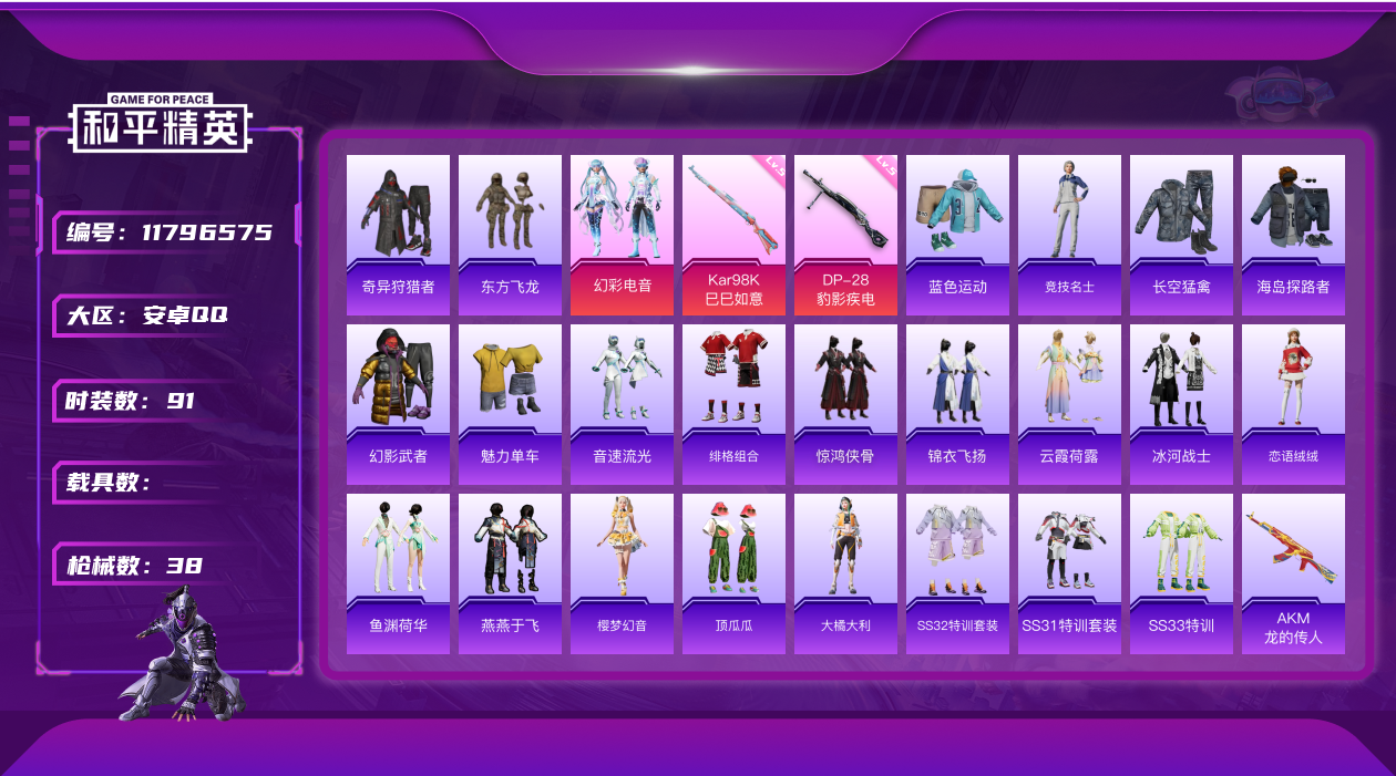 [11796575]1粉装 2特效枪 可二次 可修改实名 优质装备:奇异狩猎者,幻彩电音,Kar98K-巳巳如意 热门装扮:东方飞龙 稀有枪皮:DP-28-豹影疾电 五级特效枪:五级Kar98K-巳巳如意,五级DP-28-豹影疾电 紫色装扮:SS31特训套装,SS33特训套装,顶瓜瓜,音速流光,长空猛禽,蓝色运动,魅力单车,冰河战士,海岛探路者,幻影武者,鱼渊荷华,燕燕于飞,竞技名士,惊鸿侠骨,锦衣飞扬,云霞荷露,大橘大利,SS32特训服(SS32特训套装),绯格组合,樱梦幻音,恋语绒绒 优质战备:蜜语绒猫降落伞,幻影飞狐降落伞,墨金战记降落伞,极限特训降落伞,炫光之旅降落伞