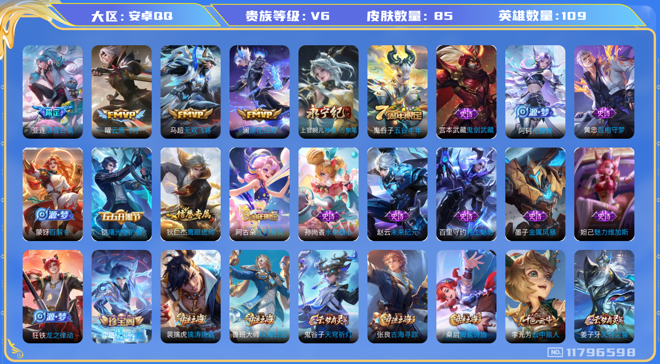[11796598]V6 4传说 109英雄 85皮肤 可修改实名 优质装备:云鹰飞将(小将军),无双飞将,澜逐花归海 传说皮:落雪白狼 珍宝阁皮:万物之道 限定皮:五谷丰年,神器·万象笔 史诗皮:化蝶舞,龙之律动,百相守梦-黄忠,特工魅影,江河有灵,百解令(蒙犽),水果甜心,鬼剑武藏,曙光守护者,金属风暴,鹰眼统帅,魅力维加斯,未来纪元-赵云