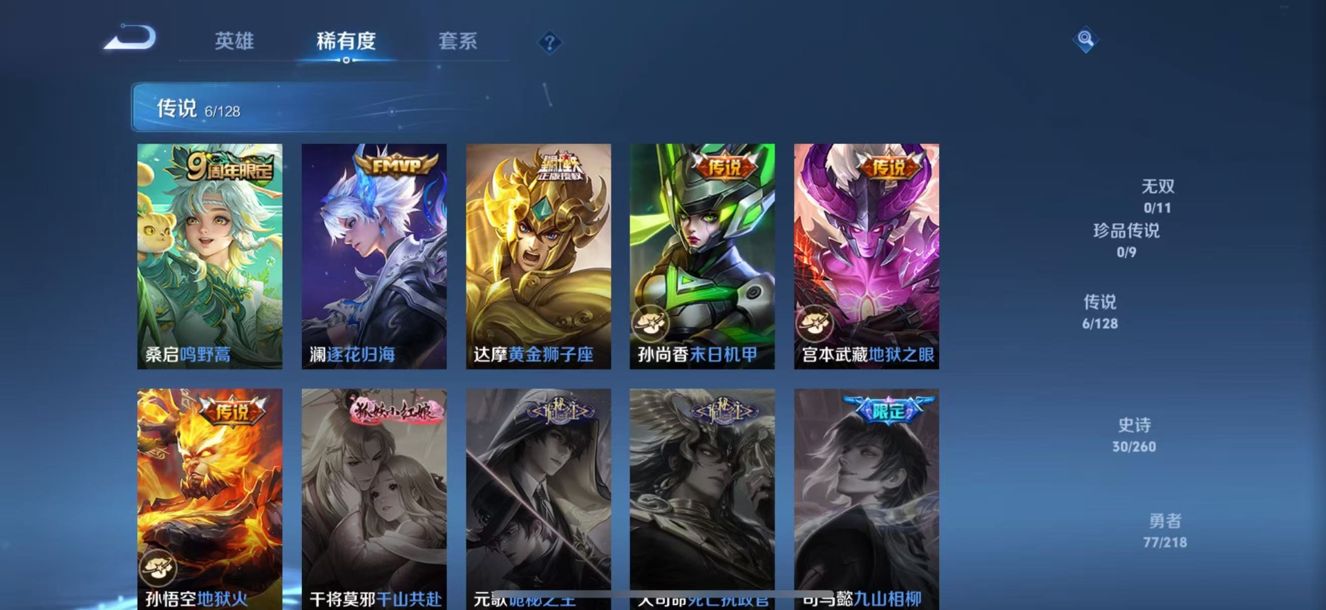 - PX_2109984-Q/非凡王者/90皮肤/92英雄/0典藏/0珍品无双/0无双/0珍品传说/11传说/19史诗/3稀有英雄 【11 传说皮肤】逐花归海 澜,无双飞将 马超,云鹰飞将 曜,记忆之芯 公孙离,炽阳神光 镜,霜月吟 露娜,一念神魔 李信,幻光神枪 云缨,愿照·山河定 司空震,鸣野蒿 桑启,续相思 西施, 【19 史诗皮肤】迷踪丽影 阿轲,魅力维加斯 妲己,女仆咖啡 妲己,鹰眼统帅 狄