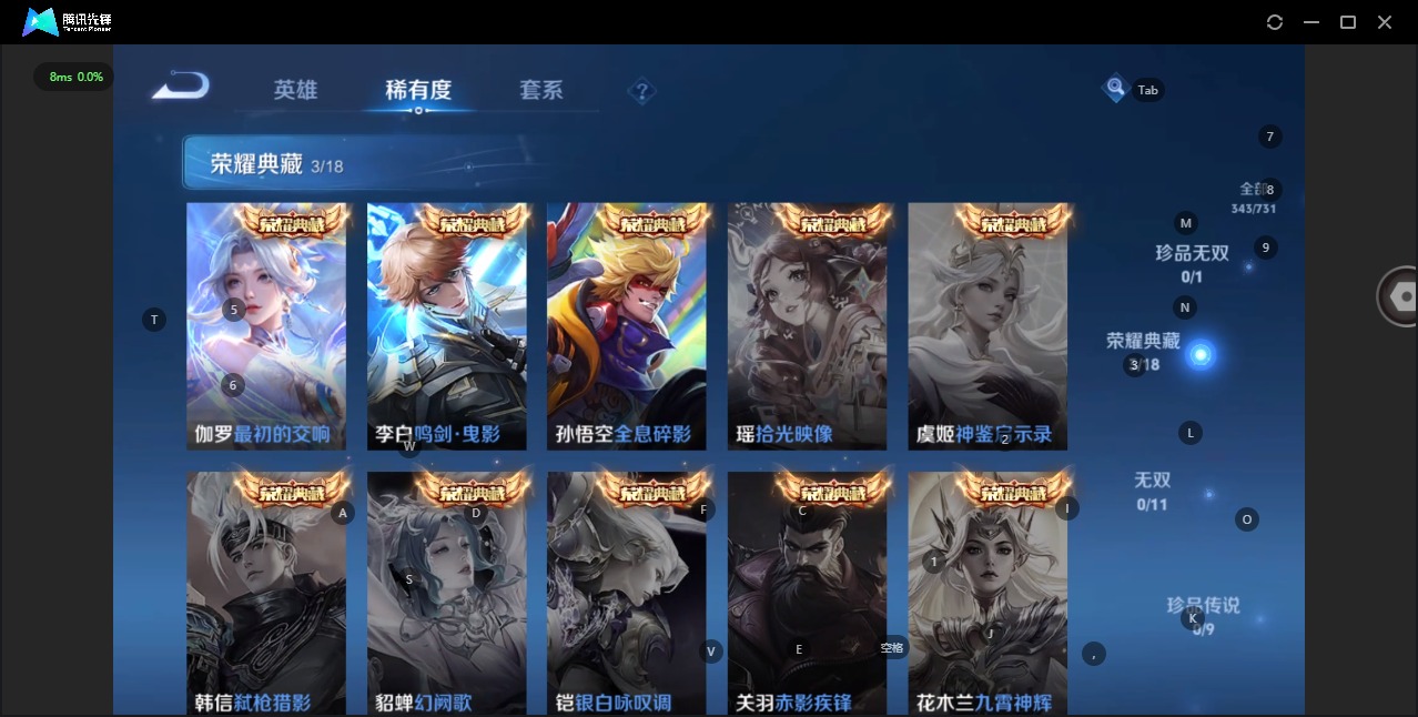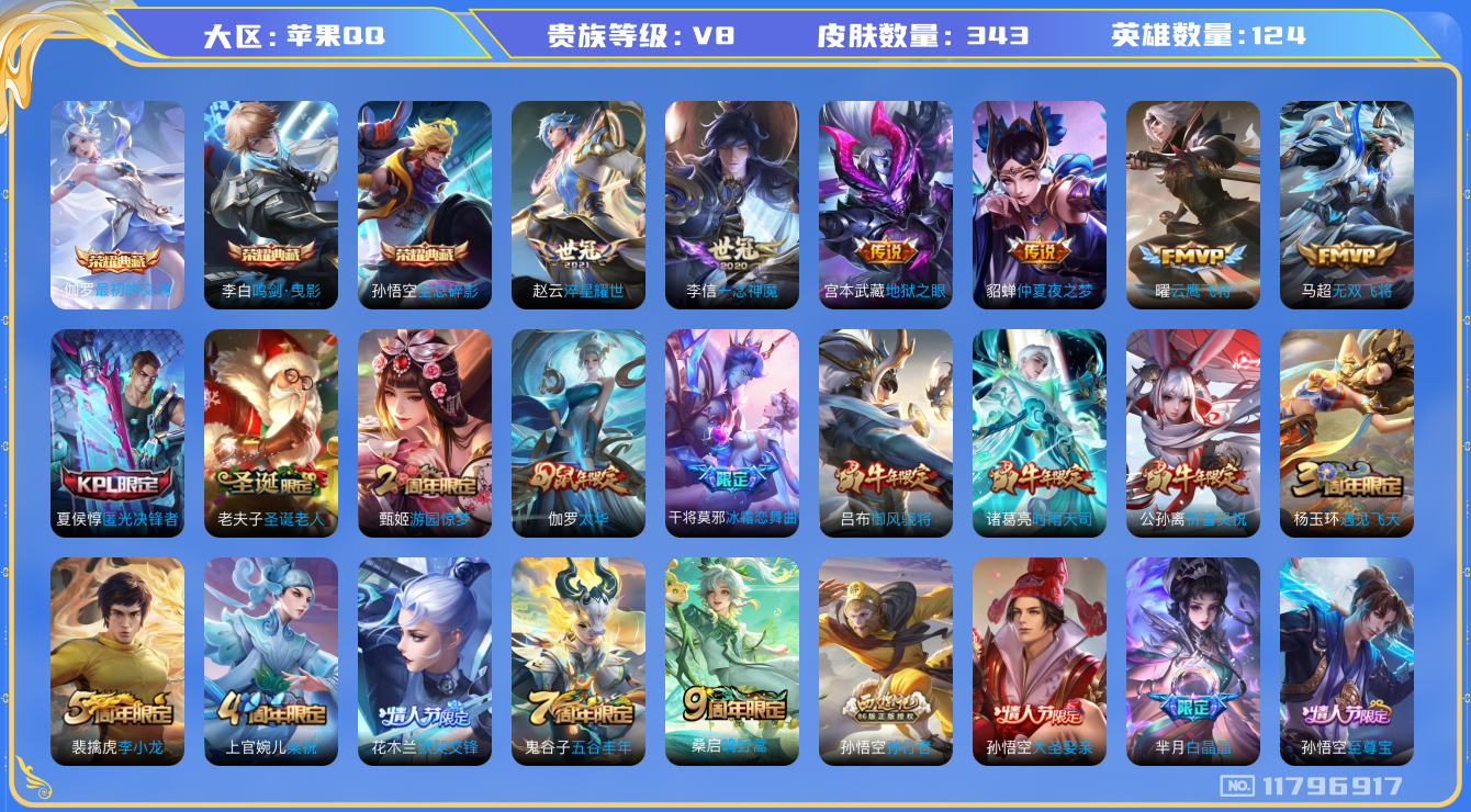 [11796917]V8 3典藏 11传说 124英雄 343皮肤 可修改实名 优质装备:鸣剑·曳影,全息碎影(猴子典藏),最初的交响(伽罗典藏),云鹰飞将(小将军),一念神魔,仲夏夜之梦(大飞蛾),地狱之眼,淬星耀世,无双飞将 珍宝阁皮:女武神,玩趣恶龙 限定皮:鸣野蒿,至尊宝,凤凰于飞,太华(伽罗年限),白晶晶,时雨天司(水龙头),遇见飞天,匿光决锋者,五谷丰年,冰锋战神,游园惊梦,梁祝,御风骁将(吕布年限),祈雪灵祝(雪兔子),李小龙,霸王别姬-虞姬,圣诞老人,默契交锋-花木兰,孙行者,大圣娶亲,冰霜恋舞曲 史诗皮:赞萌露比,龙之律动,石田雨龙,百相守梦-周瑜,怒海争锋,蔬乡物语(鲁班七号),百相守梦-百里守约,紫霞仙子,电玩小子(小书包),白龙吟,黄金分割率,特工魅影,千年之狐,雪夜绮愿(周瑜),魅语,百解令(蒙犽),高渐离燃音魔法,冰冠公主,偶像歌手,晚萤,末日机甲-吕布,猫狗日记-孙策,猫狗日记-大乔,时之恋人-孙尚香,乱世虎臣,节奏热浪,修罗,女仆咖啡,摇滚巨星,水果甜心,绅士熊喵,星夜王子,心灵骇客,功夫厨神,德古拉伯爵,暗隐猎兽者,鬼剑武藏,心灵战警,天秀·启明,舞动绿茵,地狱岩魂,诗语江南,纤云弄巧,繁星吟游(呼啦呼啦),拒霜思,缤纷独角兽,乘风破浪,逐浪之夏,水晶猎龙者,曙光守护者,箭羽风息,金属风暴,原初追逐者,圣诞狂欢,圣诞恋歌,鹰眼统帅,暗夜贵公子,魅力维加斯,黎明之约,赏金猎手,无心,未来纪元-赵云