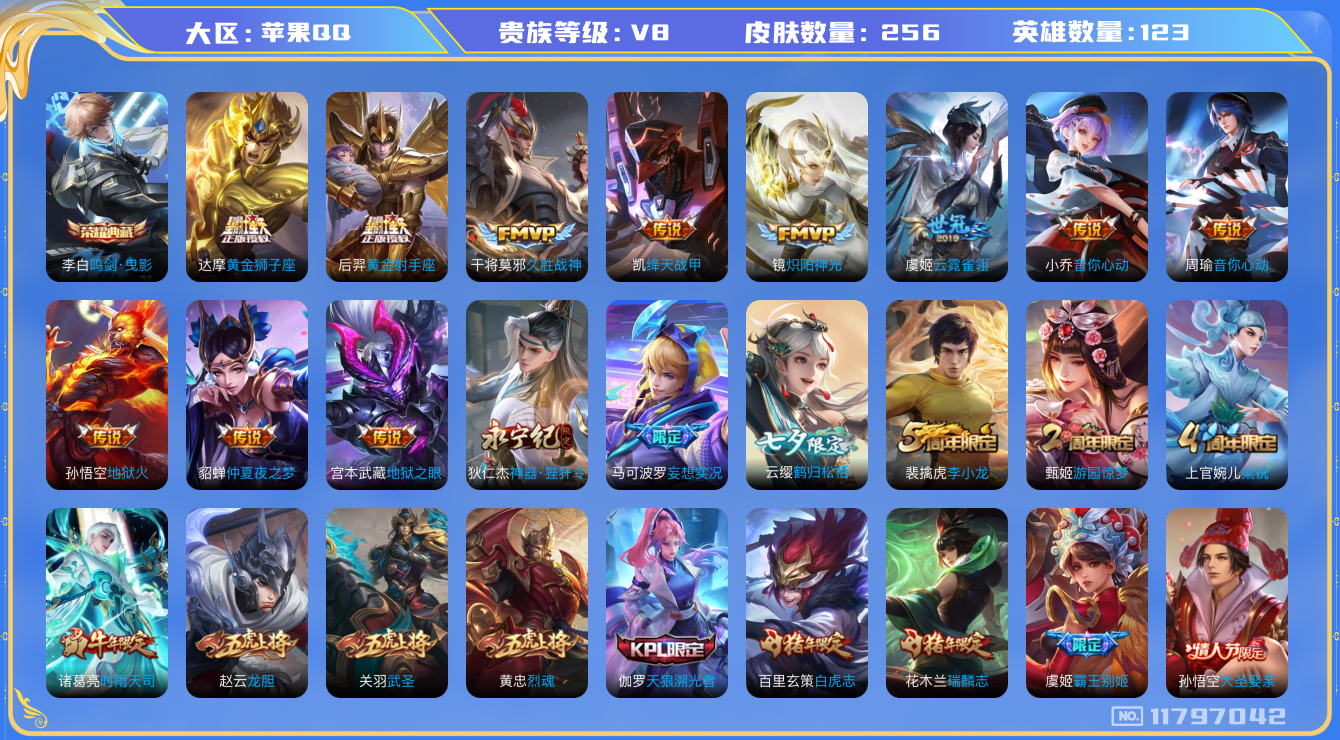 - PX_2095067-实名: 可修改 贵族等级: V7 英雄数: 124 皮肤数: 114 传说皮: 冠军飞将,黄金白羊座,猫影幻舞,超时空战士-狄仁杰,山海·苍雷引,乘龙·淬吴钩 限定皮: 御风骁将,龙胆,烈魂,孙行者,五谷丰年,神器·万象笔,山海·玄木吟