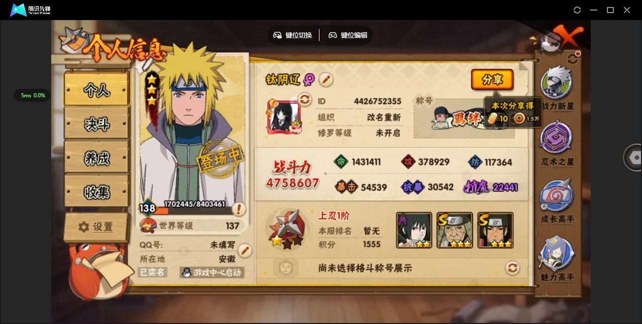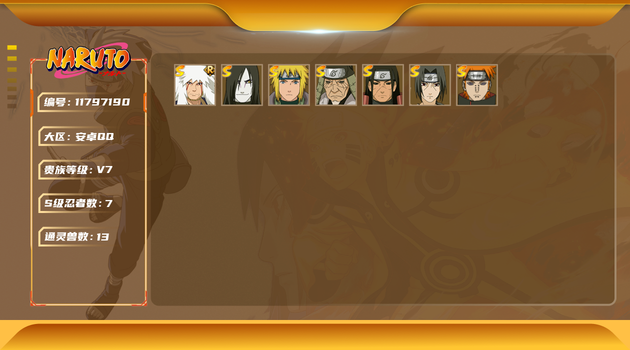 [11797190]V7 7S忍 17A忍 13通灵 475.8W战力 可二次 可修改实名 优质装备:千手柱间「秽土转生」,猿飞日斩「秽土转生」 S级忍者:自来也 「舞之豪杰」,宇智波鼬 「须佐能乎」,佩恩「天道」,波风水门,大蛇丸