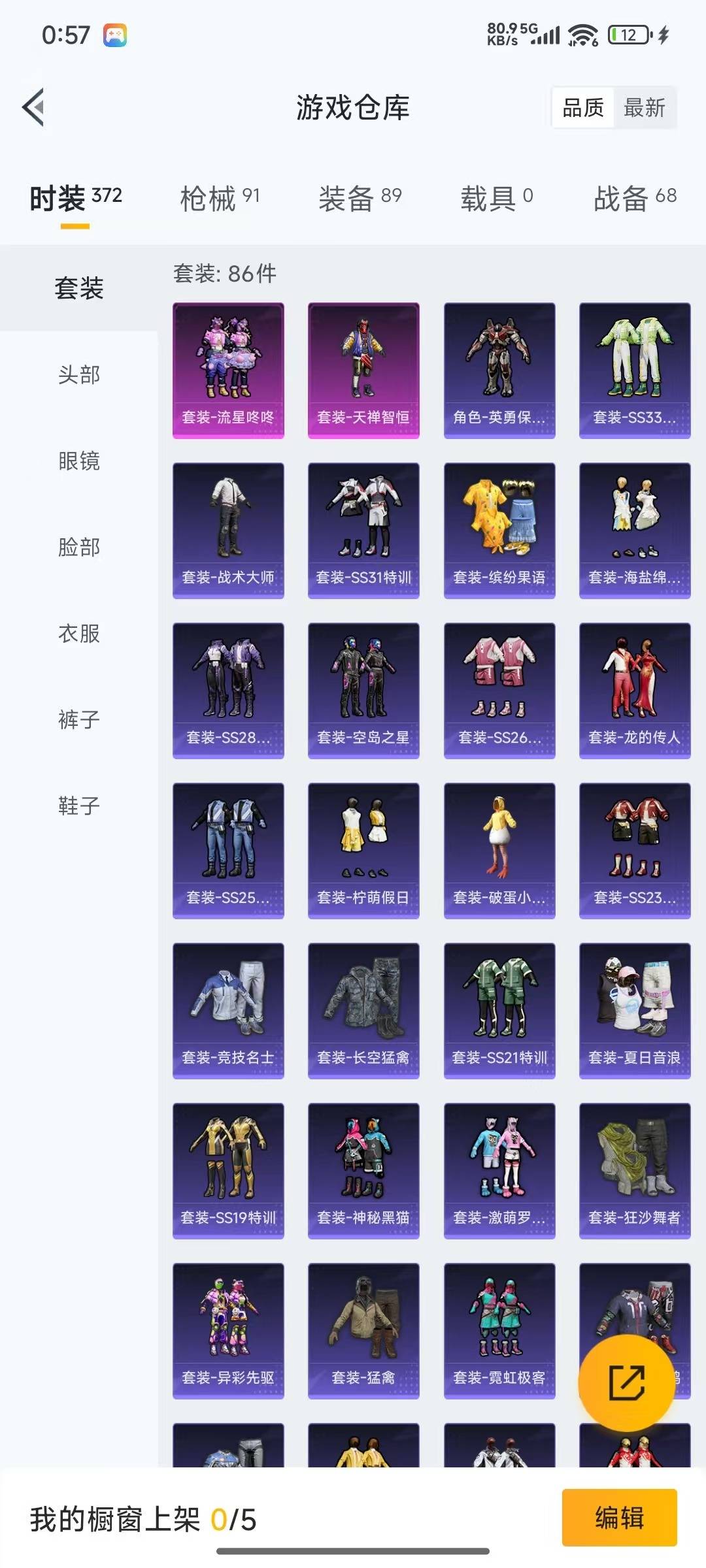 - [10046085]实名: 可修改 时装数: 514 载具数: 2 枪械数: 162 战备数: 119 热门装扮: 宝贝奶油派,梦魇先生,万圣娃娃,迅捷狂鲨,东方飞龙,绚金战神,巡查员衣服,银龙傲海,骨龙祭渊 载具: 玛莎拉蒂Ghibli(蓝),合金龙骨(蓝) 稀有枪皮: M762甜蜜誓约,M416心之恋语