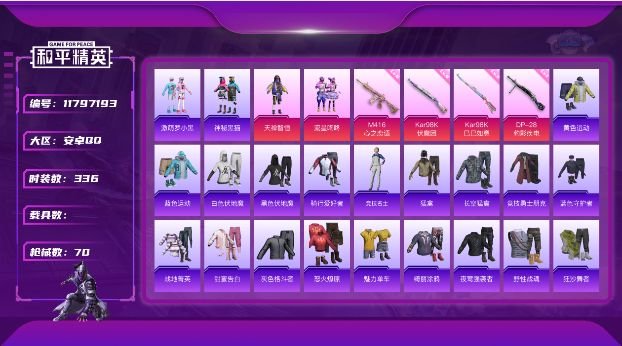 [11797193]2粉装 4特效枪 4印记 可二次 可修改实名 优质装备:Kar98K伏魔团,M416心之恋语,天禅智恒,Kar98K-巳巳如意 热门装扮:流星咚咚,神秘黑猫,激萌罗小黑 稀有枪皮:DP-28-豹影疾电 六级特效枪:六级M416-心之恋语 四级特效枪:四级Kar98K-伏魔团 三级特效枪:三级Kar98K-巳巳如意 一级特效枪:一级DP-28-豹影疾电 紫色装扮:SS23特训,SS21特训,SS31特训套装,SS2特训,SS3特训,北国孤狼,午夜朋克,SS33特训套装,青涩时光,暗夜傀儡,SS16特训,萌趣颜团子,特种颜团子,SS19特训,英勇保护者,瑞龙福将,团圆交子,SS17特训,异彩先驱,SS18特训,野性战魂,长空猛禽,霓虹极客,霓虹街区,缤纷果语,蓝色守护者,蓝色运动,虎虎生威吉莉,跃动心情,骑行爱好者,魅力单车,黄色运动,黑色伏地魔,龙的传人,极地朋克,柠萌假日,格斗先锋,派对绅士,深蓝色名流,夏日音浪,夜莺强袭者,怒火燎原,战地菁英,攀登者,绮丽涂鸦,甜蜜菠萝,疯狂小兔子,白色伏地魔,破蛋小黄鸡,甜蜜告白,福星高照,空岛之星,空投萌叽,竞技勇士朋克,潮流炫酷,灰色格斗者,牛气满满,猛禽,狂沙舞者,SS28特训,竞技名士,SS25特训,SS26特训,精神漫游,炽焰拳师,格斗专家,SS6特训,黑色刀锋,核芯基因,SS7特训,拳皇97草薙京,SS8特训,舞夜骑士,红酒骑士,SS11特训,幻影公爵,WiFi精灵,丛林猎人,传奇侦探,特种空勤,半糖蓝莓 优质战备:古堡领主降落伞,飞行器-伏魔团,四圣焕新降落伞,葫芦兄弟降落伞,暗夜玫瑰降落伞,海渊国主降落伞