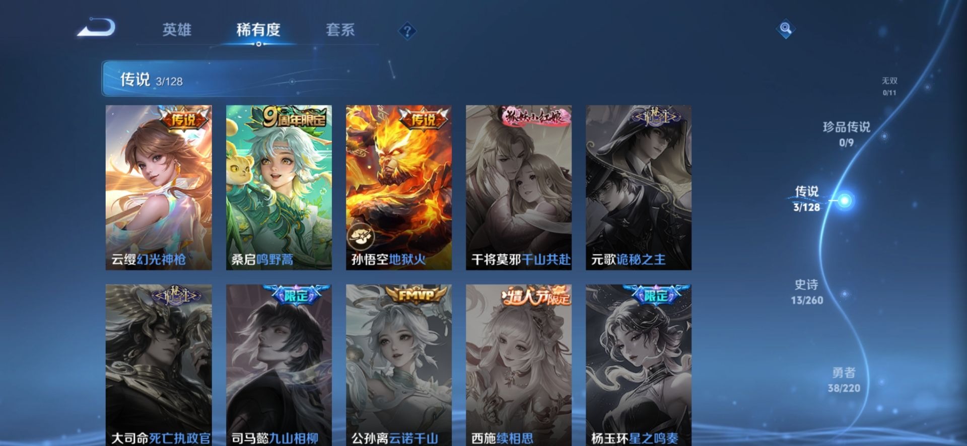 - [11554230]V7 1典藏 5传说 124英雄 197皮肤 可修改实名 荣耀水晶:鸣剑·曳影 传说皮:云鹰飞将(小将军),炽阳神光,妄想实况 珍宝阁皮:胡桃夹子,女武神 限定皮:鸣野蒿,至尊宝,诗剑行,五谷丰年,烈魂,岱宗(典韦年限),天狼绘梦者,李小龙,大圣娶亲,山海·玄木吟(马可年限) 史诗皮:鸭鸭历险记-刘禅,龙之律动,蔬乡物语(鲁班七号),化蝶舞,破空之剑,紫霞仙子,电玩小子(小书包),黄金分割率,特工魅影,千年之狐,蒙恬荣光圣徽,冰冠公主,晚萤,无限星赏官,猫狗日记-孙策,猫狗日记-大乔,乱世虎臣,节奏热浪,修罗,水果甜心,心灵骇客,幽灵船长,鬼剑武藏,舞动绿茵,地狱岩魂,繁星吟游(呼啦呼啦),缤纷独角兽,逐浪之夏,曙光守护者,金属风暴,原初追逐者,圣诞狂欢,圣诞恋歌,鹰眼统帅,暗夜贵公子,魅力维加斯,无心,未来纪元-赵云