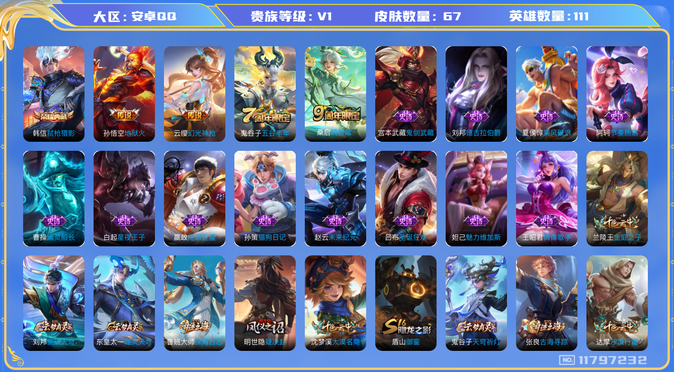 - [12205078]V7 4传说 110英雄 116皮肤 可修改实名 优质装备:炽阳神光 传说皮:乘龙·淬吴钩(孙策年限) 珍宝阁皮:蔷薇恋人 限定皮:逐霄战戟,鸣野蒿,齐天大圣,五谷丰年,游园惊梦 史诗皮:琥珀纪元伽罗,战舞者,东方月初,芈月浮光幕影,怒海争锋,黄金分割率,特工魅影,浮梦罗烟,江河有灵,百解令(蒙犽),高渐离燃音魔法,蒙恬荣光圣徽,电玩·爆裂旋风,末日机甲-吕布,水果甜心,功夫厨神,暗隐猎兽者,鬼剑武藏,心灵战警,舞动绿茵,曙光守护者,金属风暴,未来纪元-赵云