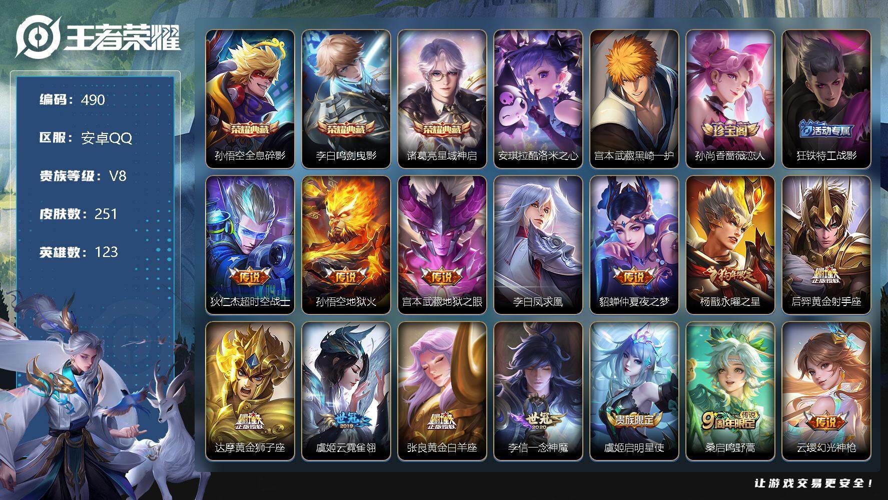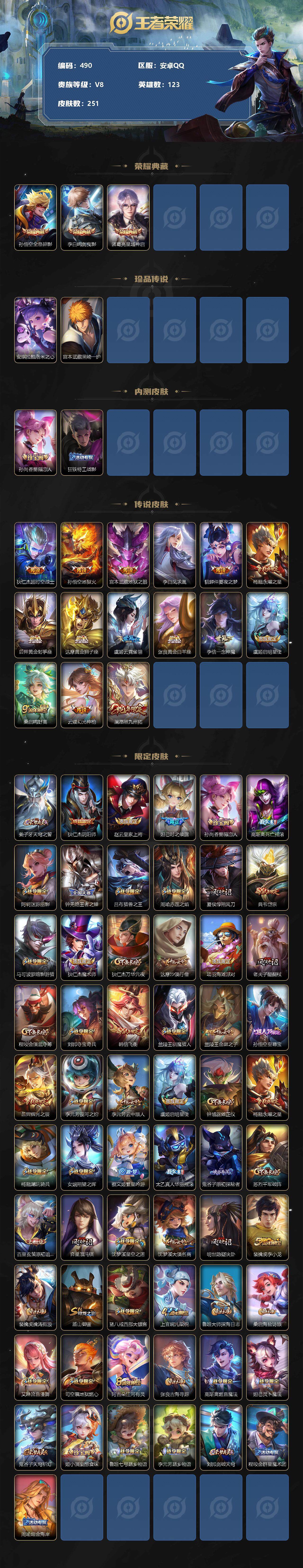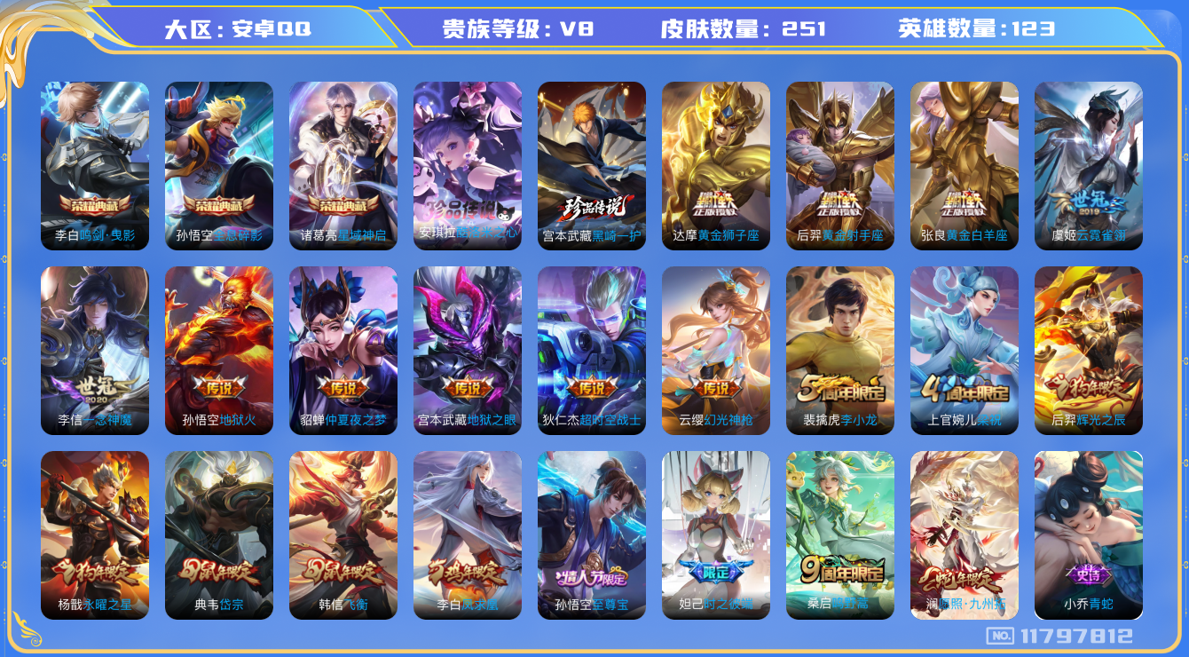 [11797812]【商品标题】:安卓Q-V8-至尊星耀III段位-123英雄-251皮肤-3典藏-0珍品无双-0无双-2珍品传说-15传说-68史诗