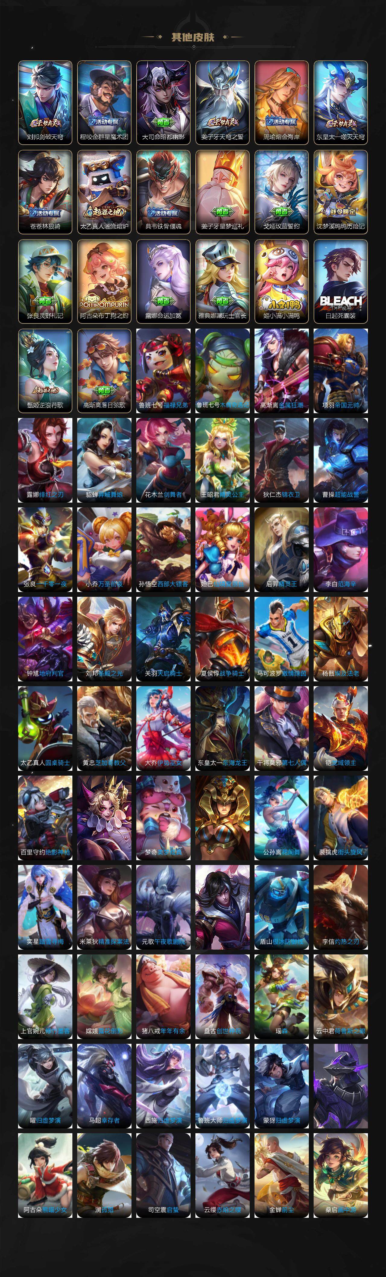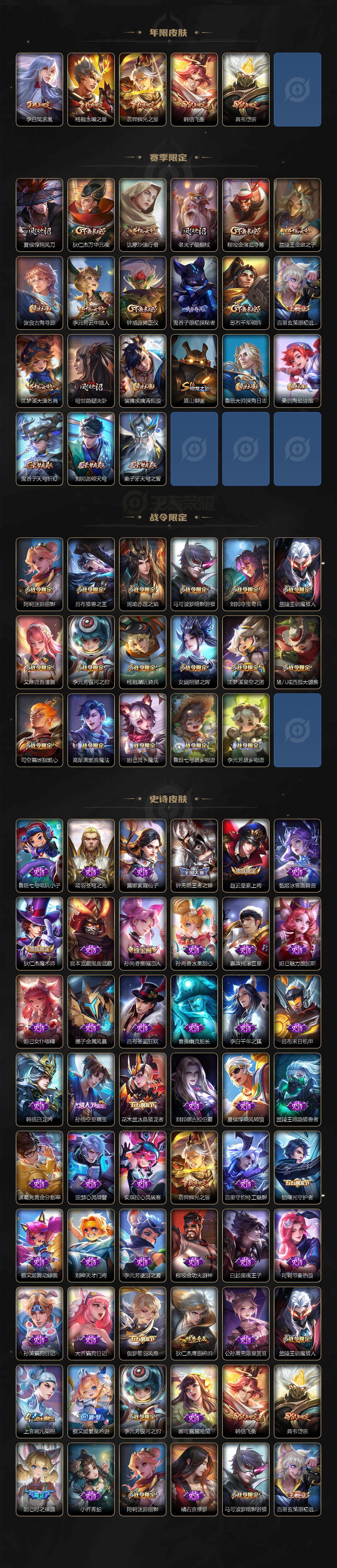 【赛季限定】:夏侯惇朔风刀,狄仁杰万华元夜,达摩沙漠行僧,老夫子醍醐杖,程咬金演武夺筹,兰陵王金庭之子,张良古海寻踪,李元芳云中旅人,钟馗驱傩正仪,鬼谷子原初探秘者,苏烈千军破阵,百里玄策原初追逐者,弈星混沌棋,沈梦溪大漠名商,明世隐疑决卦,裴擒虎擒涛扼浪,盾山御銮,鲁班大师探海日志,桑启海盐诗旅,鬼谷子天穹祈灯,刘邦剑破天穹,姜子牙天穹之誓