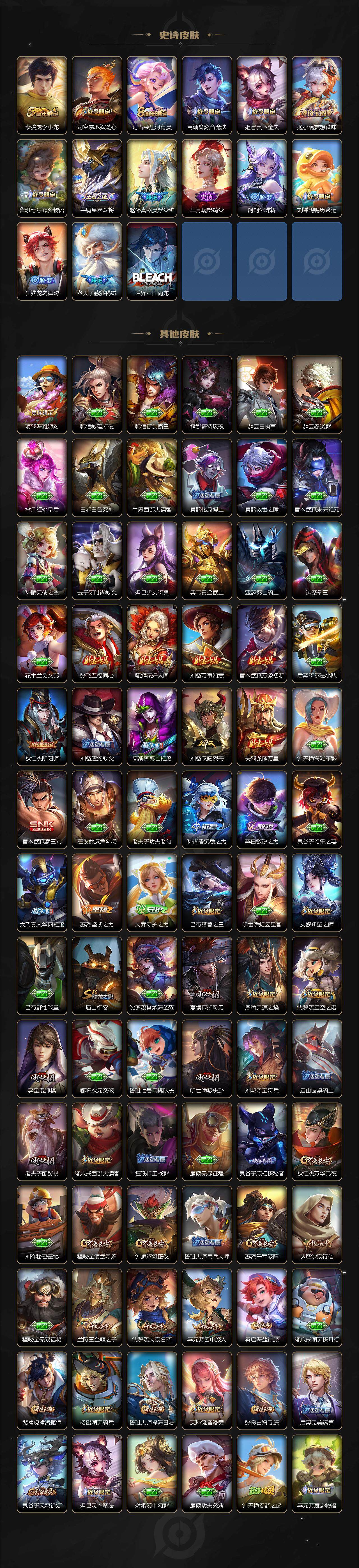 【限定皮肤】:姜子牙天穹之誓,狄仁杰阴阳师,赵云皇家上将,妲己时之彼端,孙尚香蔷薇恋人,高渐离死亡摇滚,阿轲迷踪丽影,钟无艳王者之锤,吕布猎兽之王,周瑜赤莲之焰,夏侯惇朔风刀,典韦岱宗,马可波罗暗影游猎,狄仁杰魔术师,狄仁杰万华元夜,达摩沙漠行僧,项羽海滩派对,老夫子醍醐杖,程咬金演武夺筹,刘邦夺宝奇兵,韩信飞衡,兰陵王驯魔猎人,兰陵王金庭之子,孙悟空至尊宝,后羿辉光之辰,李元芳银河之约,李元芳云中旅人,虞姬启明星使,钟馗驱傩正仪,杨戬永曜之星,杨戬潮玩骑兵,女娲朔望之晖,蔡文姬繁星吟游,太乙真人华丽摇滚,鬼谷子原初探秘者,苏烈千军破阵,百里玄策原初追逐者,弈星混沌棋,沈梦溪星空之诺,沈梦溪大漠名商,明世隐疑决卦,裴擒虎李小龙,裴擒虎擒涛扼浪,盾山御銮,猪八戒西部大镖客,上官婉儿梁祝,鲁班大师探海日志,桑启海盐诗旅,艾琳流音漫舞,司空震地狱燃心,阿古朵江河有灵,张良古海寻踪,高渐离燃音魔法,妲己灵卜魔法,鬼谷子天穹祈灯,姬小满妄想食味,鲁班七号蔬乡物语,李元芳蔬乡物语,刘邦剑破天穹,程咬金群星魔术团,周瑜熔金海岸