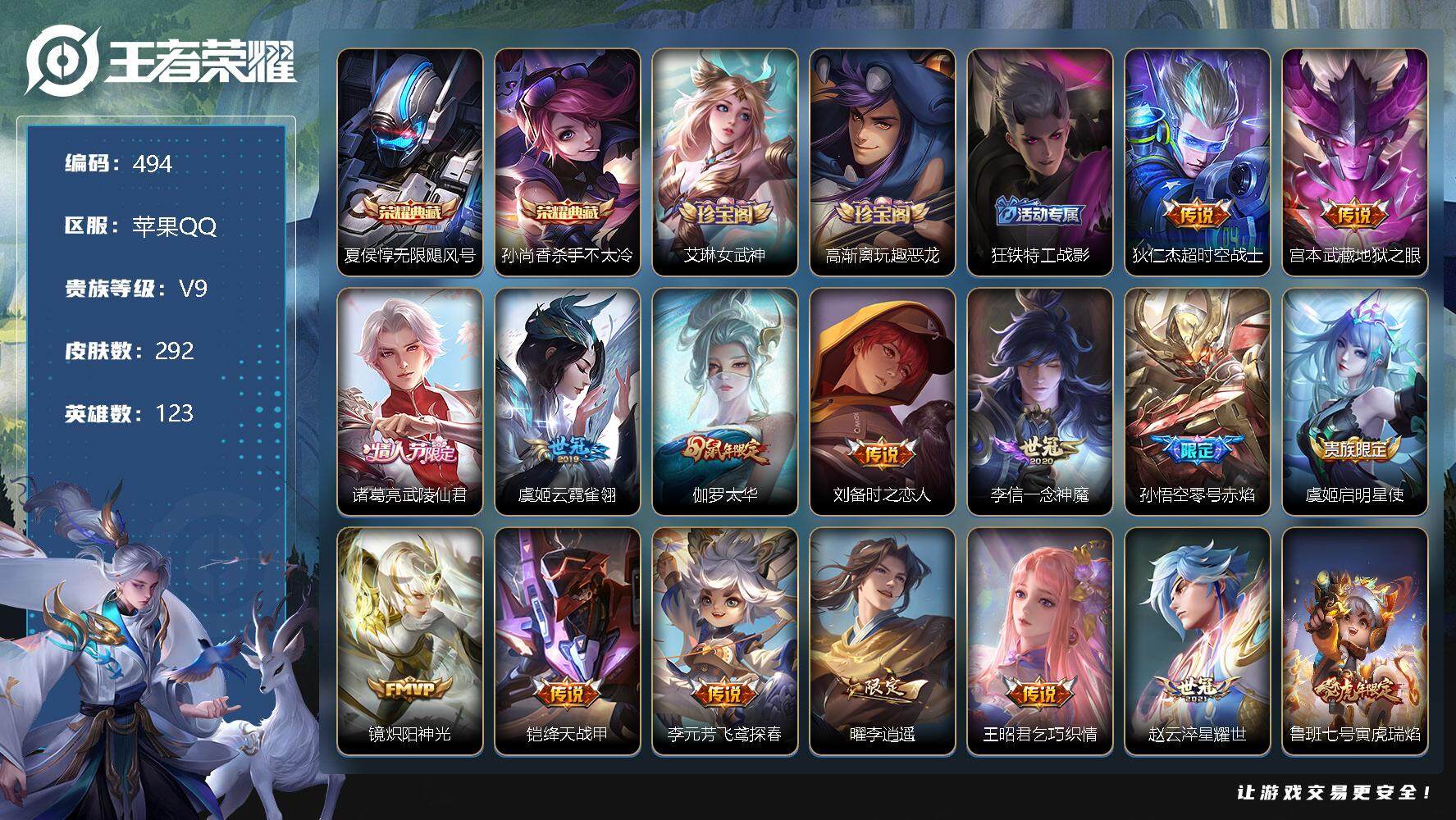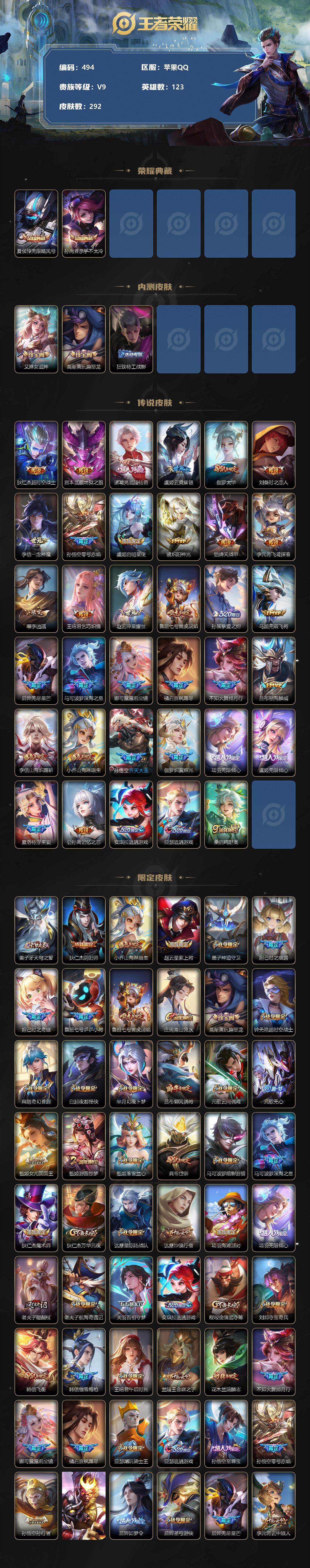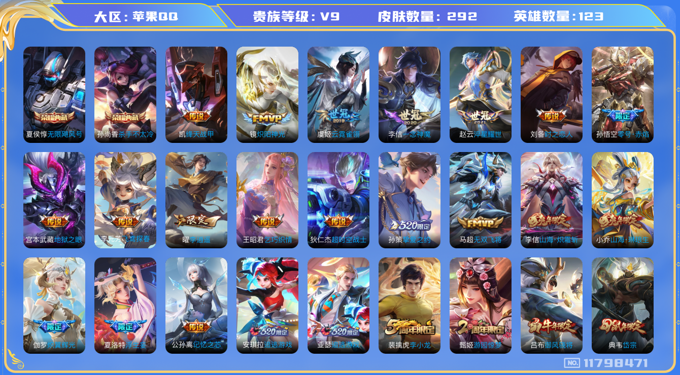 [11798471]【商品标题】:苹果Q-V9-永恒钻石III段位-123英雄-292皮肤-2典藏-0珍品无双-0无双-0珍品传说-35传说-94史诗