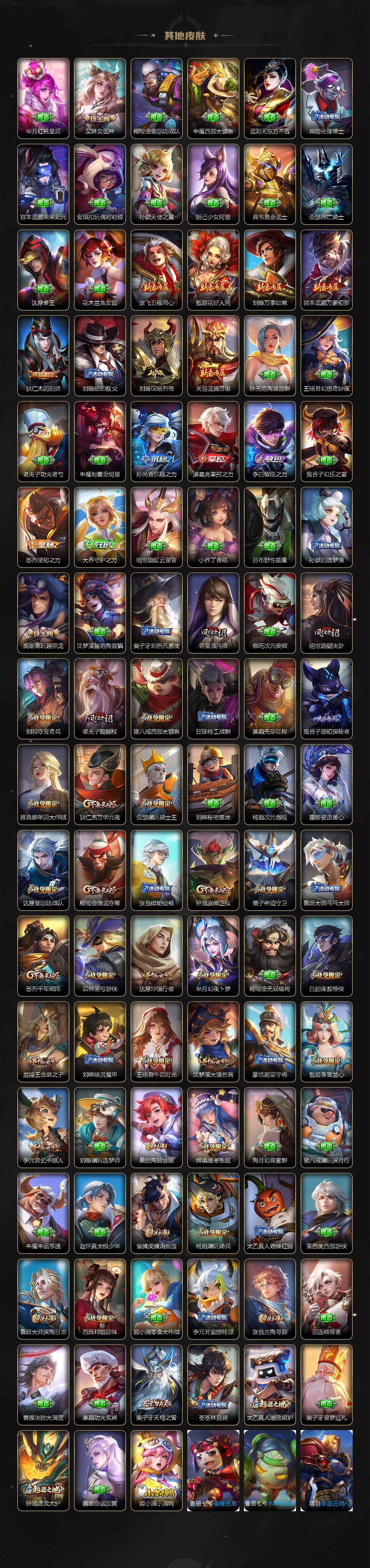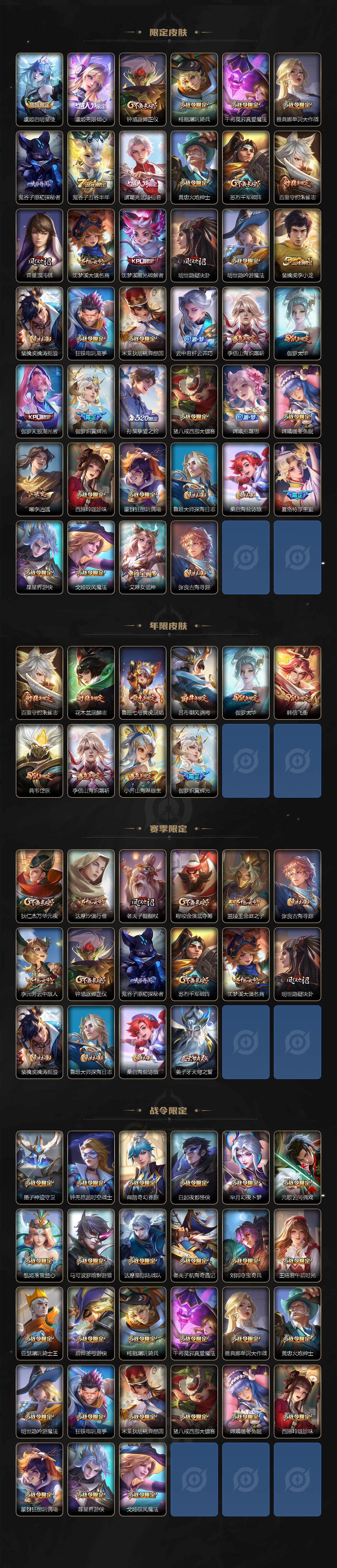 【限定皮肤】:姜子牙天穹之誓,狄仁杰阴阳师,小乔山海琳琅生,赵云皇家上将,墨子神迹守卫,妲己时之彼端,妲己时之奇旅,鲁班七号乒乒小将,鲁班七号寅虎瑞焰,庄周高山流水,高渐离玩趣恶龙,钟无艳超时空战士,扁鹊奇幻香踪,白起夜都怪侠,芈月幻夜卜梦,吕布御风骁将,元歌云间偶戏,元歌无心,甄姬女儿国国王,甄姬游园惊梦,甄姬落雪兰心,典韦岱宗,马可波罗暗影游猎,马可波罗深海之息,狄仁杰魔术师,狄仁杰万华元夜,达摩星际陆战队,达摩沙漠行僧,项羽海滩派对,项羽无限倾心,老夫子醍醐杖,老夫子航海奇遇记,关羽百相守梦,安琪拉追逃游戏,程咬金演武夺筹,刘邦夺宝奇兵,韩信飞衡,韩信傲雪梅枪,王昭君午后时光,兰陵王金庭之子,花木兰瑞麟志,不知火舞绯月行,娜可露露前尘镜,橘右京枫霜尽,亚瑟潮玩骑士王,亚瑟追逃游戏,孙悟空至尊宝,孙悟空零号赤焰,孙悟空孙行者,孙悟空齐天大圣,后羿如梦令,后羿圣弓游侠,后羿无尽星芒,李元芳云中旅人,虞姬启明星使,虞姬无限倾心,钟馗驱傩正仪,杨戬潮玩骑兵,干将莫邪真爱魔法,雅典娜单词大作战,鬼谷子原初探秘者,鬼谷子五谷丰年,诸葛亮武陵仙君,黄忠火炮绅士,苏烈千军破阵,百里守约朱雀志,弈星混沌棋,沈梦溪大漠名商,沈梦溪匿光破解者,明世隐疑决卦,明世隐吟游魔法,裴擒虎李小龙,裴擒虎擒涛扼浪,狂铁电玩高手,米莱狄胡桃异想国,云中君纤云弄巧,李信山海炽霜斩,伽罗太华,伽罗天狼溯光者,伽罗炽翼辉光,孙策挚爱之约,猪八戒西