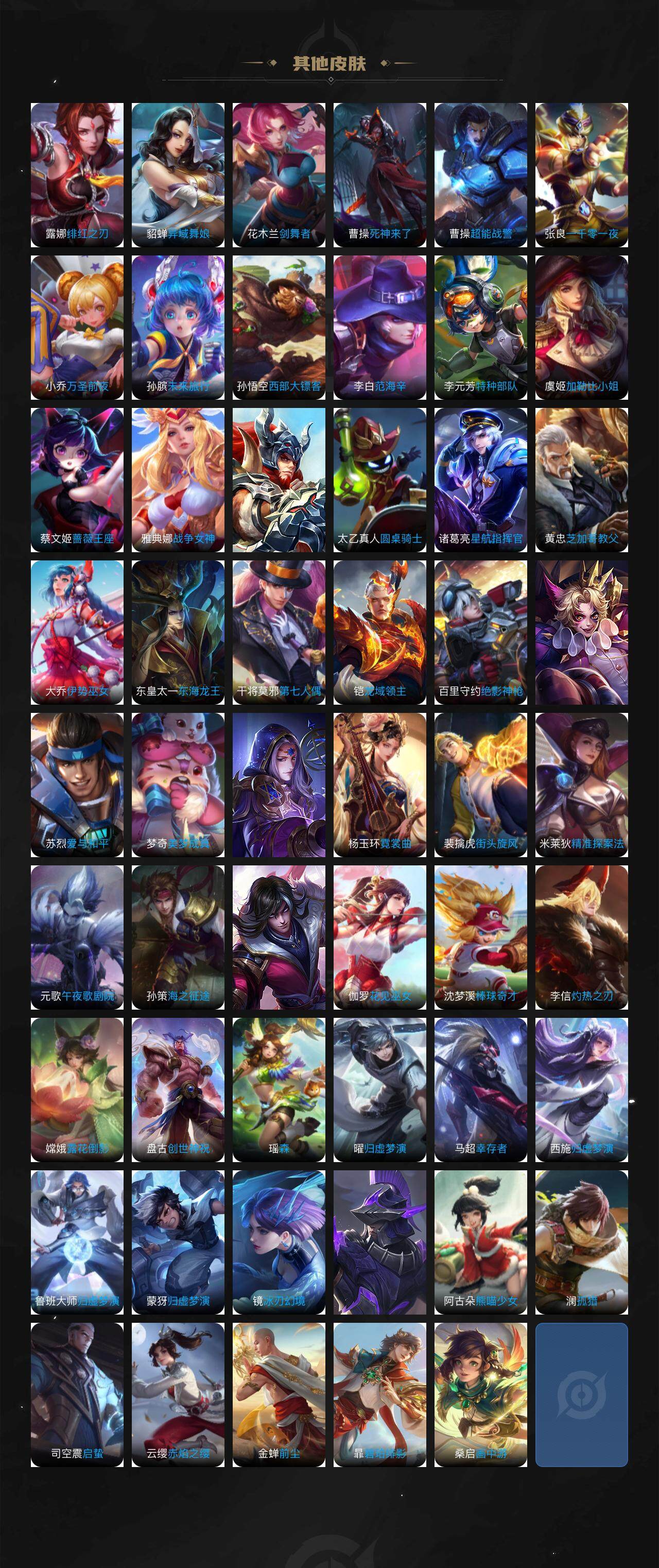 娜可露露晚萤,李元芳逐浪之夏,不知火舞魅语,公孙离无限星赏官,大乔猫狗日记,孙策猫狗日记,阿轲节奏热浪,露娜紫霞仙子,诸葛亮黄金分割率,王昭君偶像歌手,韩信白龙吟,项羽苍穹之光,孙尚香时之恋人,阿轲暗夜猫娘,雅典娜冰冠公主,吕布末日机甲,鲁班七号电玩小子,墨子龙骑士,嬴政摇滚巨星,刘禅绅士熊喵,刘禅天才门将,白起星夜王子,安琪拉心灵骇客,安琪拉时之奇旅,程咬金功夫厨神,刘邦德古拉伯爵,兰陵王暗隐猎兽者,曹操幽灵船长,宫本武藏鬼剑武藏,亚瑟心灵战警,杨戬天秀·启明,蔡文姬舞动绿茵,廉颇地狱岩魂,小乔缤纷独角兽,夏侯惇乘风破浪,花木兰水晶猎龙者,铠曙光守护者,百里玄策热力回旋,墨子金属风暴,吕布圣诞狂欢,貂蝉圣诞恋歌,百里守约特工魅影,嬴政暗夜贵公子,嫦娥拒霜思,夏洛特永昼,澜赏金猎手,艾琳奇遇舞章,高渐离天秀·音浪,张良千筹问战,关羽百相守梦,沈梦溪匿光破解者,刘禅电玩·爆裂旋风