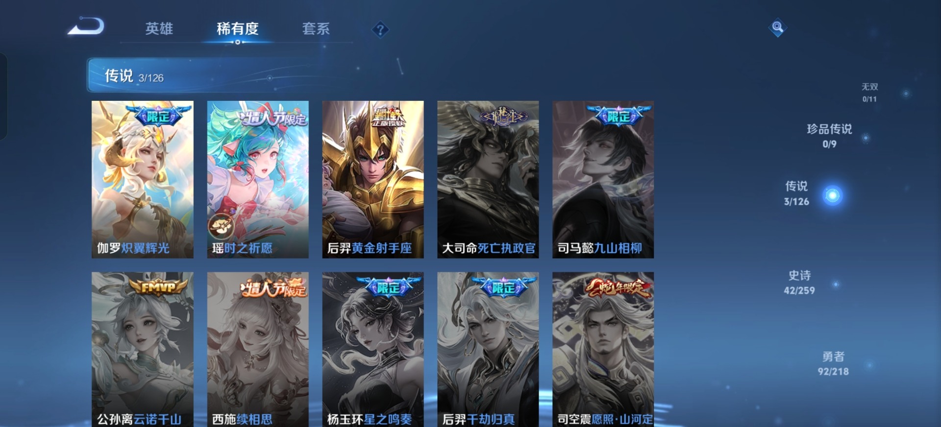 - [11656299]V7 7传说 122英雄 188皮肤 可修改实名 优质装备:黄金射手座,一念神魔,山海·炽霜斩(李信年限),山海·苍雷引(电光曜子) 珍宝阁皮:女武神 限定皮:至尊宝,白虎志(电光耗子),傲雪梅枪,齐天大圣,五谷丰年,天狼征服者,李小龙,朱雀志(守约年限),大圣娶亲,冰霜恋舞曲,寅虎·瑞焰(虎皮蛋子),山海·玄木吟(马可年限) 史诗皮:龙之律动,紫霞仙子,千年之狐,江河有灵,百解令(蒙犽),蒙恬荣光圣徽,猫狗日记-孙策,时之恋人-孙尚香,节奏热浪,修罗,女仆咖啡,水果甜心,天才门将,星夜王子,德古拉伯爵,暗隐猎兽者,鬼剑武藏,心灵战警,纤云弄巧,繁星吟游(呼啦呼啦),拒霜思,乘风破浪,水晶猎龙者,曙光守护者,箭羽风息,金属风暴,圣诞狂欢,圣诞恋歌,鹰眼统帅,无心,未来纪元-赵云