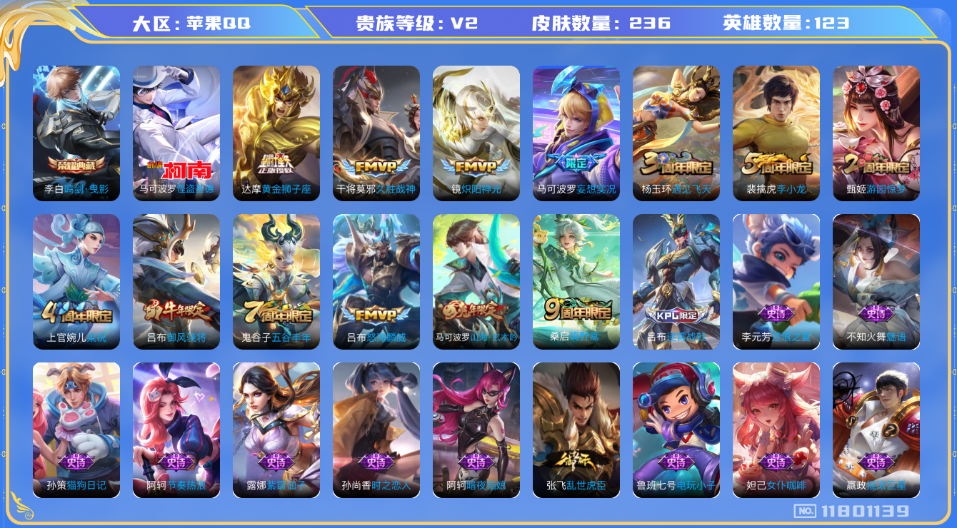 [11801139]【商品标题】:苹果Q-V2-最强王者段位-123英雄-236皮肤-1典藏-0珍品无双-0无双-1珍品传说-6传说-69史诗