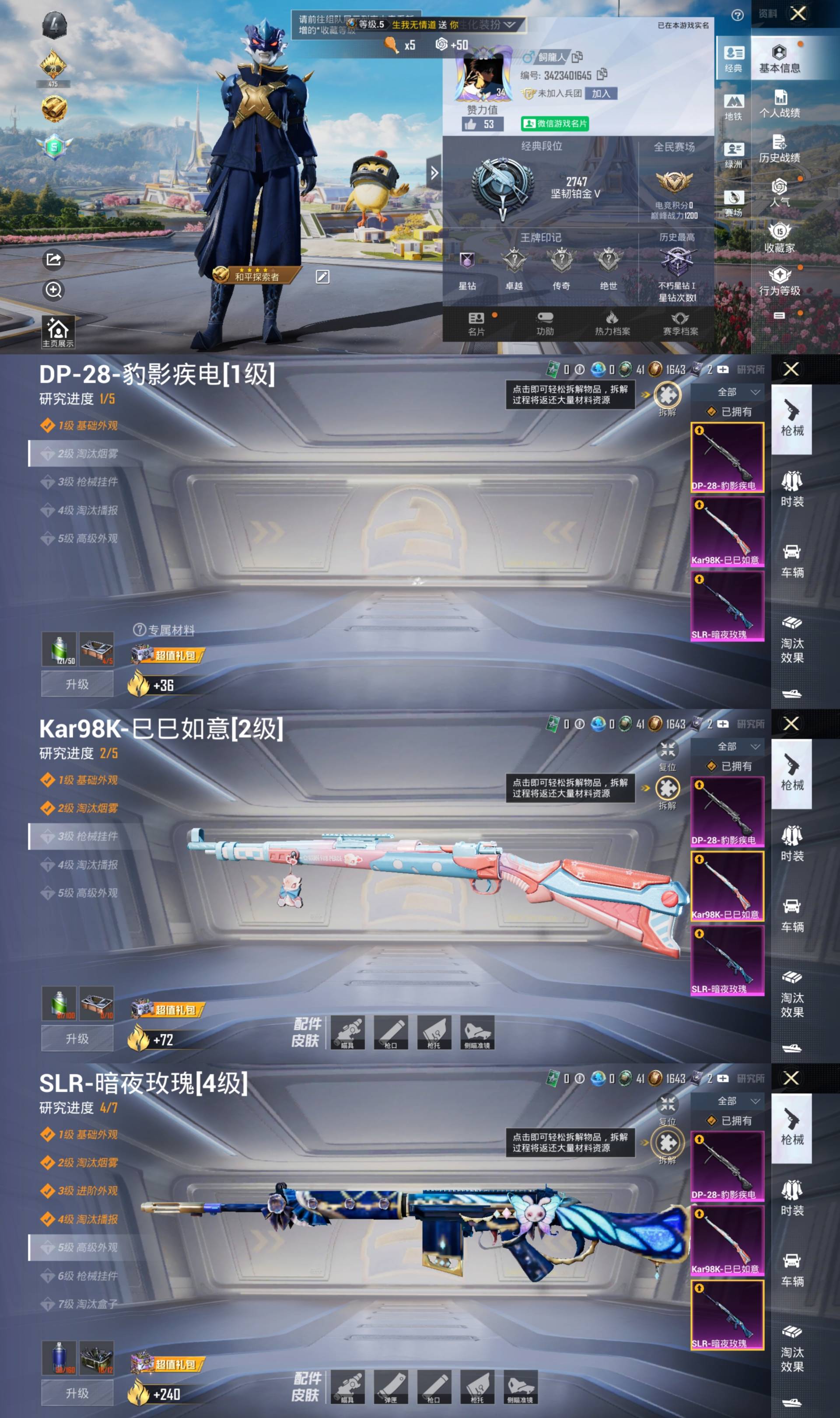 [11801736]WBDS0075 安卓V 3特效枪1热门15套装31枪皮 【3特效枪】 Kar98K-巳巳如意 (2级) DP-28-豹影疾电 (1级) SLR-暗夜玫瑰 (4级) 【1热门】 Kar98K-终极赛罗 【1飞行器】 齐天大圣飞行器 【1背包】 马卡龙背包