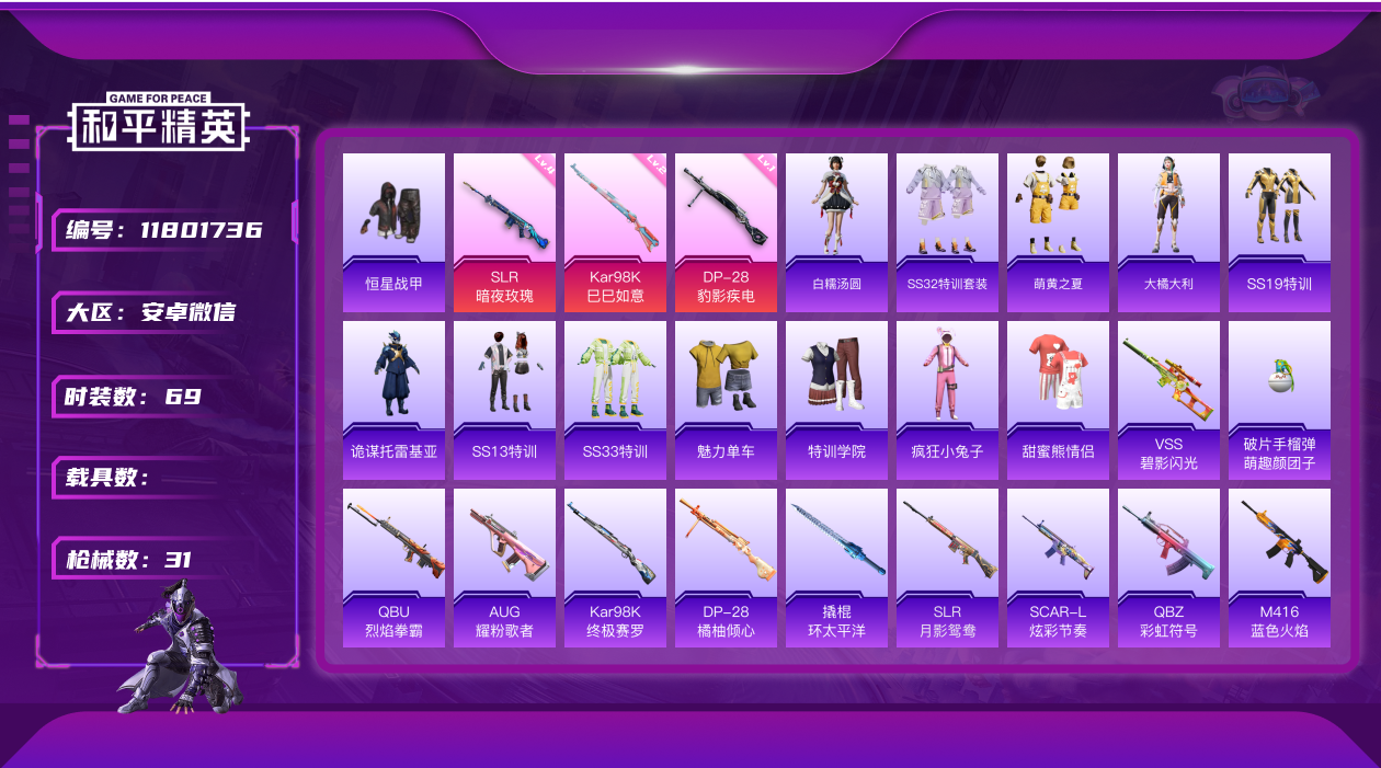 [11801736]WBDS0075 安卓V 3特效枪1热门15套装31枪皮 【3特效枪】 Kar98K-巳巳如意 (2级) DP-28-豹影疾电 (1级) SLR-暗夜玫瑰 (4级) 【1热门】 Kar98K-终极赛罗 【1飞行器】 齐天大圣飞行器 【1背包】 马卡龙背包