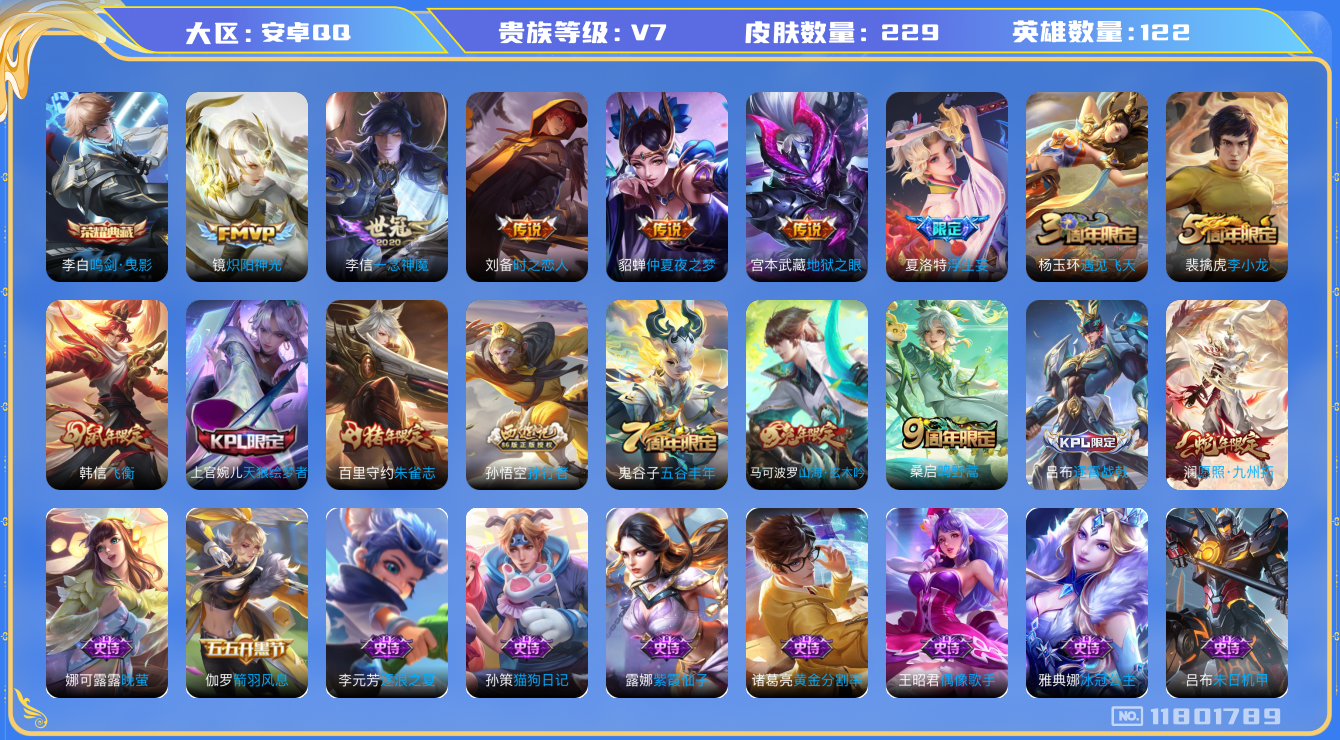 [11801789]【商品标题】:安卓Q-V7-至尊星耀II段位-122英雄-229皮肤-1典藏-0珍品无双-0无双-0珍品传说-8传说-63史诗