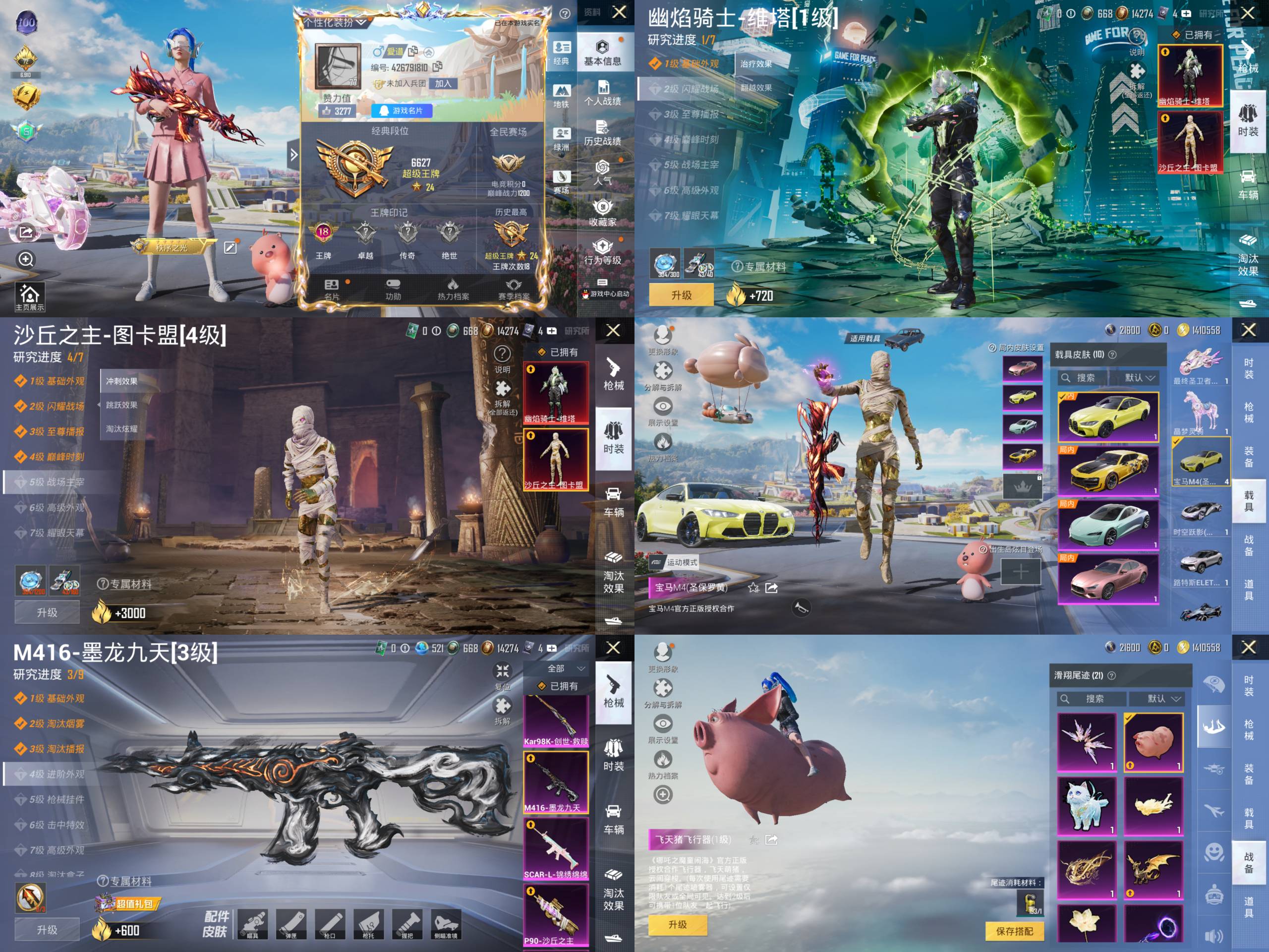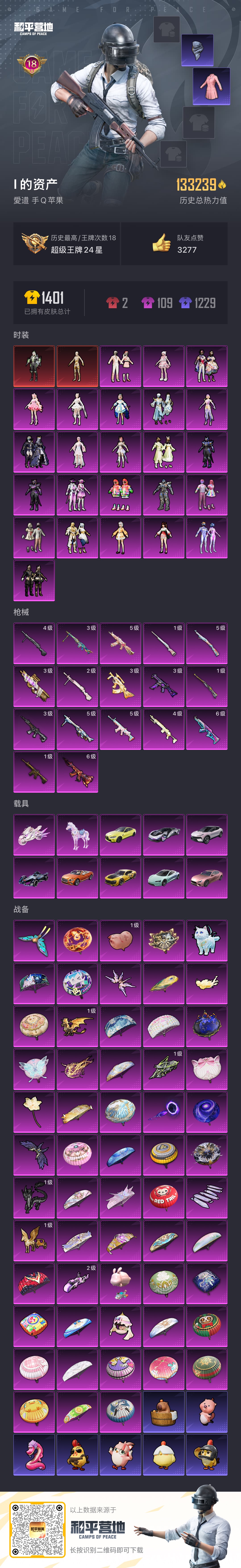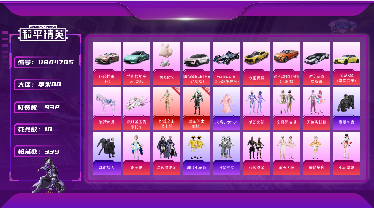 - [7413283]实名: 可修改 时装数: 277 载具数: 1 枪械数: 129 战备数: 82 热门装扮: 呆萌铁蟹,数码大师,深海小丑鱼,冰霜白皇,筑梦精灵,紫电风暴,复仇流浪者,恶魔喵喵,暗夜魅影,守护天翼 载具: 玛莎拉蒂Quattroporte(夜幕蓝) 稀有枪皮: MG3洛神天依,UMP45相思残雪,SCAR-L青春物语,AUG超新星,M24莲影清波,Kar98K-巳巳如意