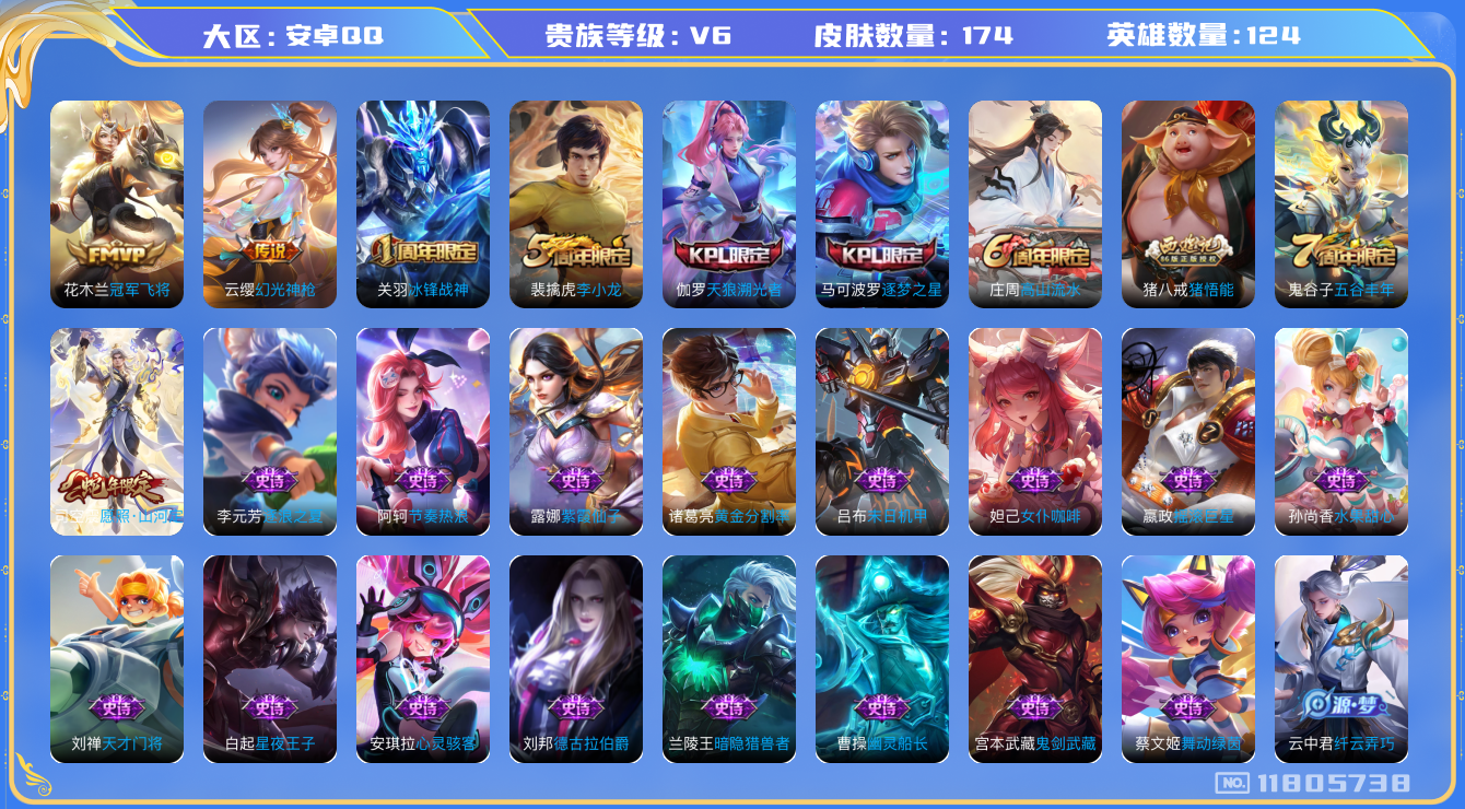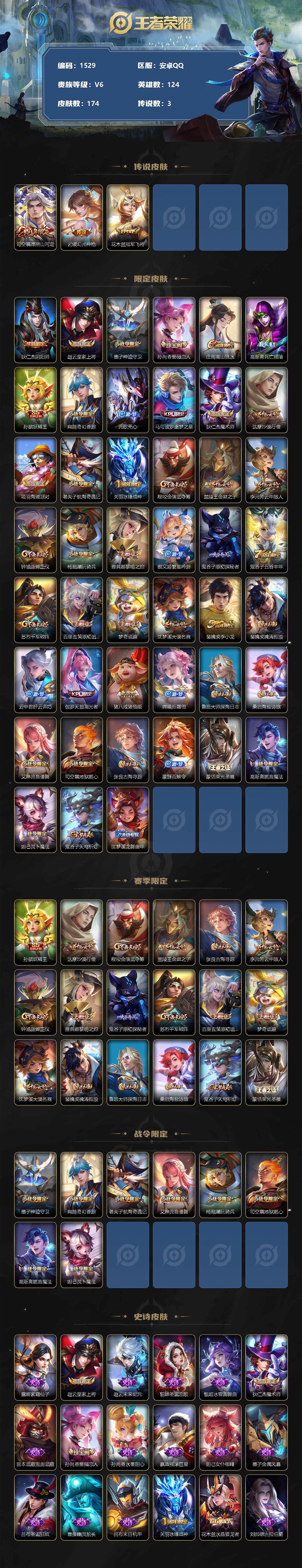 - [11648928]V10 4典藏 1无双 51传说 126英雄 483皮肤 典藏英雄武则天 可修改实名 优质装备:倪克斯神谕(宇宙婆娘),杀手不太冷,鸣剑·曳影,九霄神辉(木兰典藏),青丘·九尾(妲己无双),黄金狮子座,黄金射手座,冠军飞将,云鹰飞将(小将军),绛天战甲(鸡嘴战神),猫影幻舞,久胜战神,炽阳神光,一念神魔,云霓雀翎,末日机甲-孙尚香(绿蚂蚱),地狱火,仲夏夜之梦(大飞蛾),零号·赤焰,海洋之心,地狱之眼,飞鸢探春,胖达荣荣,李逍遥,乞巧织情,时之恋人-刘备(电焊工),游龙清影(小青龙),淬星耀世,超时空战士-狄仁杰,遇见胡旋,天秀幻梦,画中仙,浮生妄,青丘·九尾,百相守梦(张飞),追逃游戏(亚瑟),追逃游戏(安琪拉),灼幽烈阳,艾琳觅芳踪,涂山容容 珍宝阁皮:优雅恋人,玩趣恶龙 限定皮:鸣野蒿,至尊宝,白虎志(电光耗子),凤求凰(白切鸡),凤凰于飞,太华(伽罗年限),梅西,异界灵契(白毛香),傲雪梅枪,补天,寅虎·展翼(孙膑年限),前尘镜,时之彼端,白鹤梁神女,魔法小厨娘,白晶晶,时雨天司(水龙头),神威(电光马子),瑞麟志(木兰年限),遇见飞天,高山流水,怒海麟威,五谷丰年,青龙志(铠年限),冰锋战神,武圣,天狼运算者,游园惊梦,梁祝,御风骁将(吕布年限),天狼狩猎者,龙胆,逐梦之翼,逐梦之星,烈魂,岱宗(典韦年限),天狼溯光者,虎魄,天狼征服者,奔雷神使(牛魔年限),祈雪灵祝(雪兔子),天狼绘梦者,李小龙,逐梦之影,逐梦之光,玄武志(苏烈年限),朱雀志(守约年限),辉光之辰,如梦令-嫦娥,如梦令-后羿,霸王别姬-项羽,霸王别姬-虞姬,默契交锋-兰陵王,默契交锋-花木兰,真爱至上,纯白花嫁,孙行者,猪悟能,一生所爱,大圣娶亲,引擎之心,天魔缭乱,青春决赛季,冰霜恋舞曲,乒乒小将,蜜橘之夏,神奇女侠,美猴王,匿光追影者,女儿国国王,寅虎·御盾(廉颇年限),寅虎·瑞焰(虎皮蛋子),寅虎·心曲(虎婆),寅虎·赤拳(老虎年限),时之祈愿-云中君,时之祈愿-瑶(瑶传限),无尽星芒,深海之息(深海大菠萝),匿光启智者 史诗皮:灵蛊蚀心,星界战将,石田雨龙,芈月浮光幕影,蔬乡物语(鲁班七号),遇见神鹿,紫霞仙子,苍穹之光,电玩小子(小书包),白龙吟,黄金分割率,特工魅影,千年之狐,永昼,江河有灵,匿光侦查者,魅语,蒙恬荣光圣徽,无限星赏官,匿光破解者,冰冠公主,偶像歌手,晚