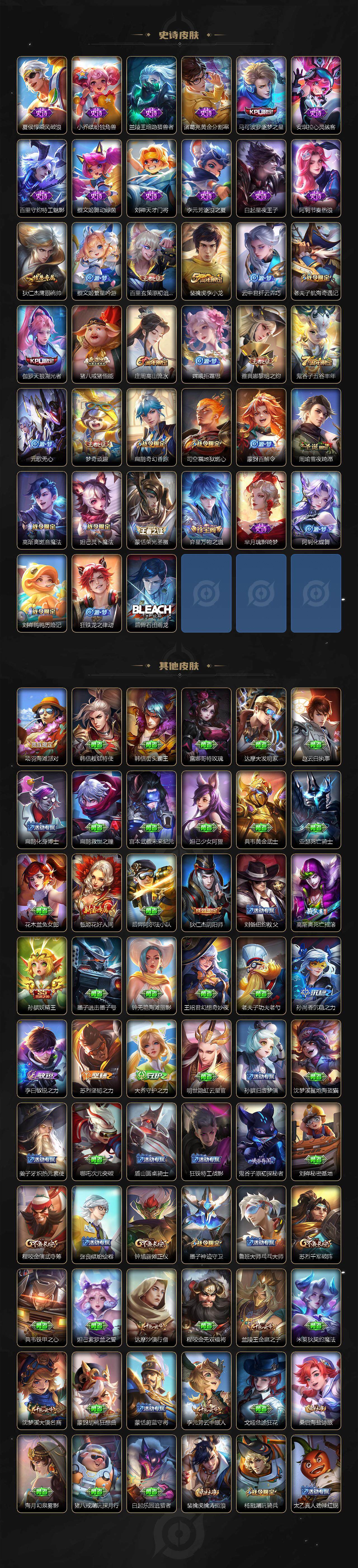 【史诗皮肤】:露娜紫霞仙子,赵云皇家上将,赵云未来纪元,貂蝉圣诞恋歌,甄姬冰雪圆舞曲,狄仁杰魔术师,宫本武藏鬼剑武藏,孙尚香蔷薇恋人,孙尚香水果甜心,嬴政摇滚巨星,妲己女仆咖啡,墨子金属风暴,吕布圣诞狂欢,曹操幽灵船长,吕布末日机甲,关羽冰锋战神,花木兰水晶猎龙者,刘邦德古拉伯爵,夏侯惇乘风破浪,小乔缤纷独角兽,兰陵王暗隐猎兽者,诸葛亮黄金分割率,马可波罗逐梦之星,安琪拉心灵骇客,百里守约特工魅影,蔡文姬舞动绿茵,刘禅天才门将,李元芳逐浪之夏,白起星夜王子,阿轲节奏热浪,狄仁杰鹰眼统帅,蔡文姬繁星吟游,百里玄策原初追逐者,裴擒虎李小龙,云中君纤云弄巧,老夫子航海奇遇记,伽罗天狼溯光者,猪八戒猪悟能,庄周高山流水,嫦娥拒霜思,雅典娜黎明之约,鬼谷子五谷丰年,元歌无心,梦奇顽趣,扁鹊奇幻香踪,司空