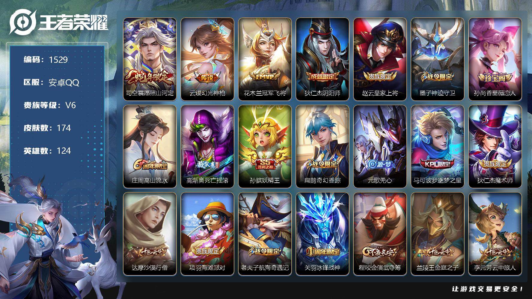 [11805738]【商品标题】:安卓Q-V4-永恒钻石II段位-124英雄-174皮肤-0典藏-0珍品无双-0无双-0珍品传说-3传说-56史诗