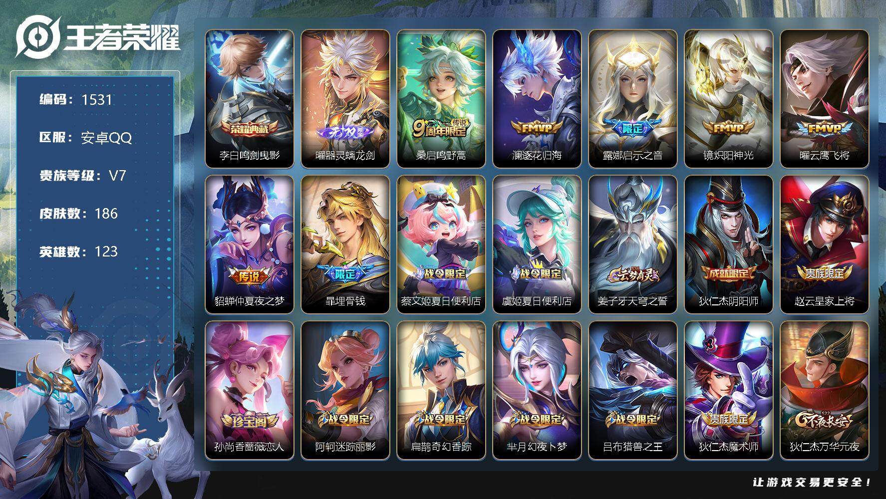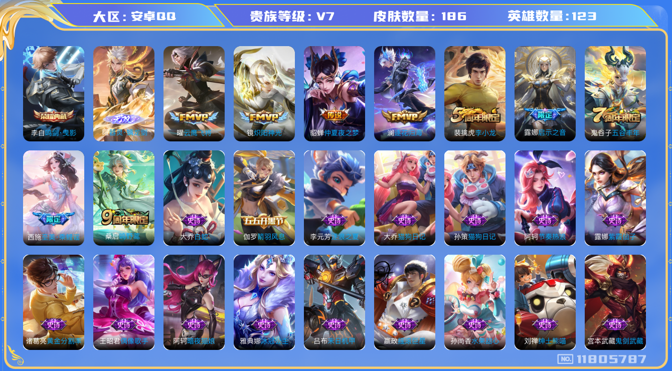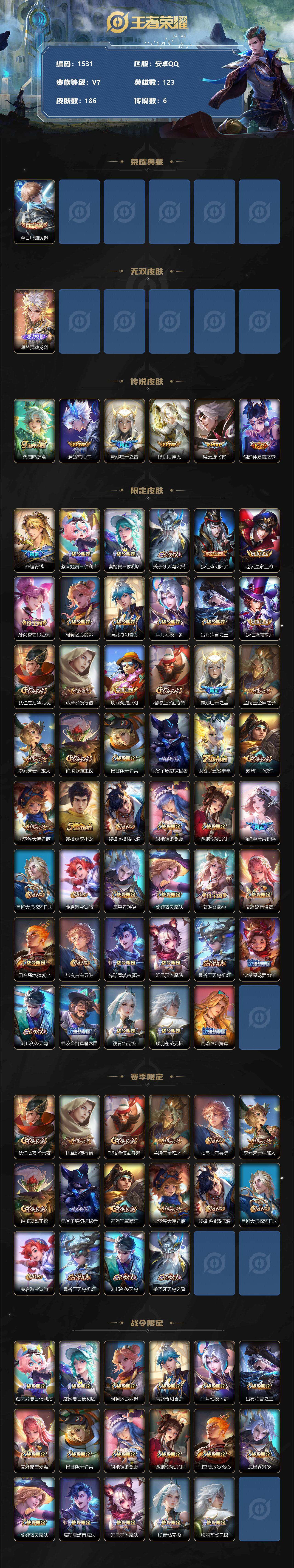 [11805787]【商品标题】:安卓Q-V7-最强王者段位-123英雄-186皮肤-1典藏-0珍品无双-1无双-0珍品传说-6传说-46史诗